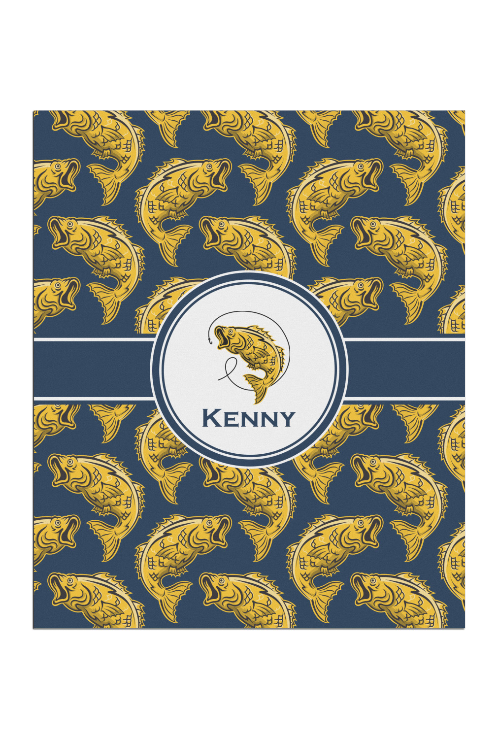 This Fish Design is perfect for all the fishermen in your life. The design is shown with yellow fish on a navy blue background. However, both the background and fish colors can be changed Through the center of the design, there is ribbon with a label. The label contains a fish and hook graphic, but this graphic can be changed to a different fish or other graphic. Just like the fish and background, the ribbon and label color can be customized.