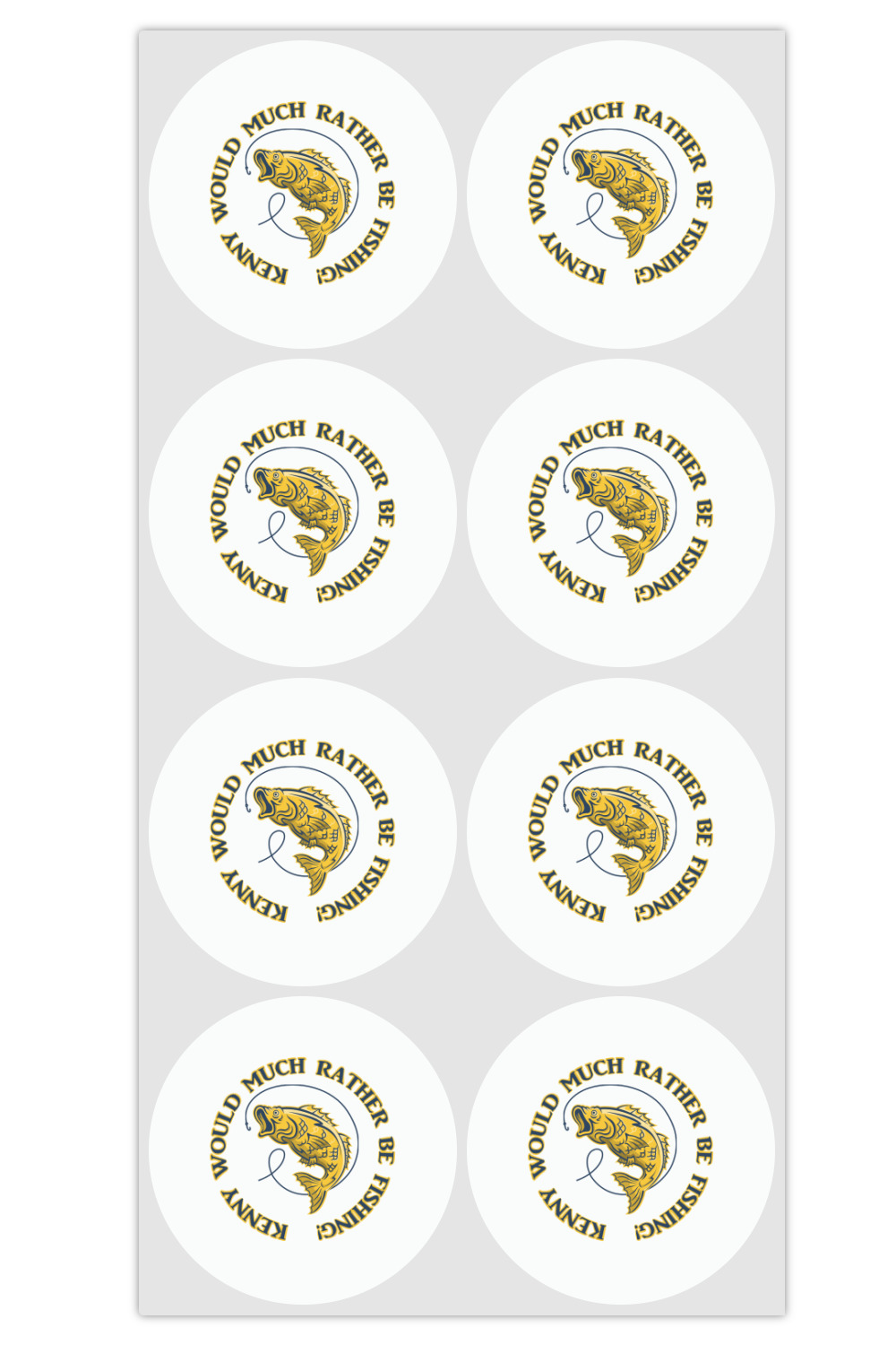 This Fish Design is perfect for all the fishermen in your life. The design is shown with yellow fish on a navy blue background. However, both the background and fish colors can be changed Through the center of the design, there is ribbon with a label. The label contains a fish and hook graphic, but this graphic can be changed to a different fish or other graphic. Just like the fish and background, the ribbon and label color can be customized.