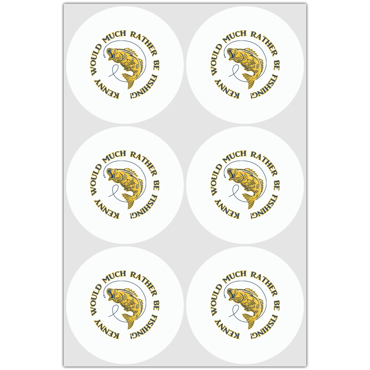 This Fish Design is perfect for all the fishermen in your life. The design is shown with yellow fish on a navy blue background. However, both the background and fish colors can be changed Through the center of the design, there is ribbon with a label. The label contains a fish and hook graphic, but this graphic can be changed to a different fish or other graphic. Just like the fish and background, the ribbon and label color can be customized.