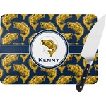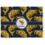 This Fish Design is perfect for all the fishermen in your life. The design is shown with yellow fish on a navy blue background. However, both the background and fish colors can be changed Through the center of the design, there is ribbon with a label. The label contains a fish and hook graphic, but this graphic can be changed to a different fish or other graphic. Just like the fish and background, the ribbon and label color can be customized.