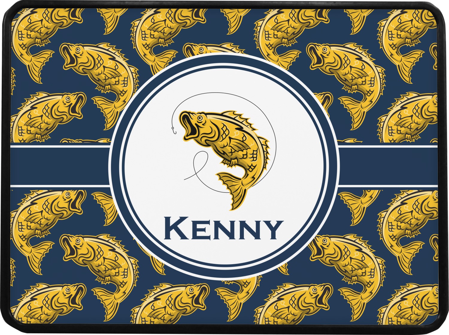 This Fish Design is perfect for all the fishermen in your life. The design is shown with yellow fish on a navy blue background. However, both the background and fish colors can be changed Through the center of the design, there is ribbon with a label. The label contains a fish and hook graphic, but this graphic can be changed to a different fish or other graphic. Just like the fish and background, the ribbon and label color can be customized.