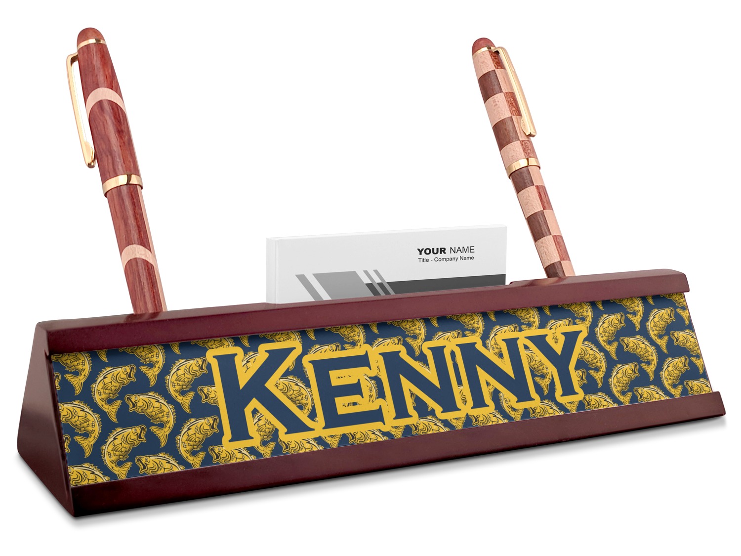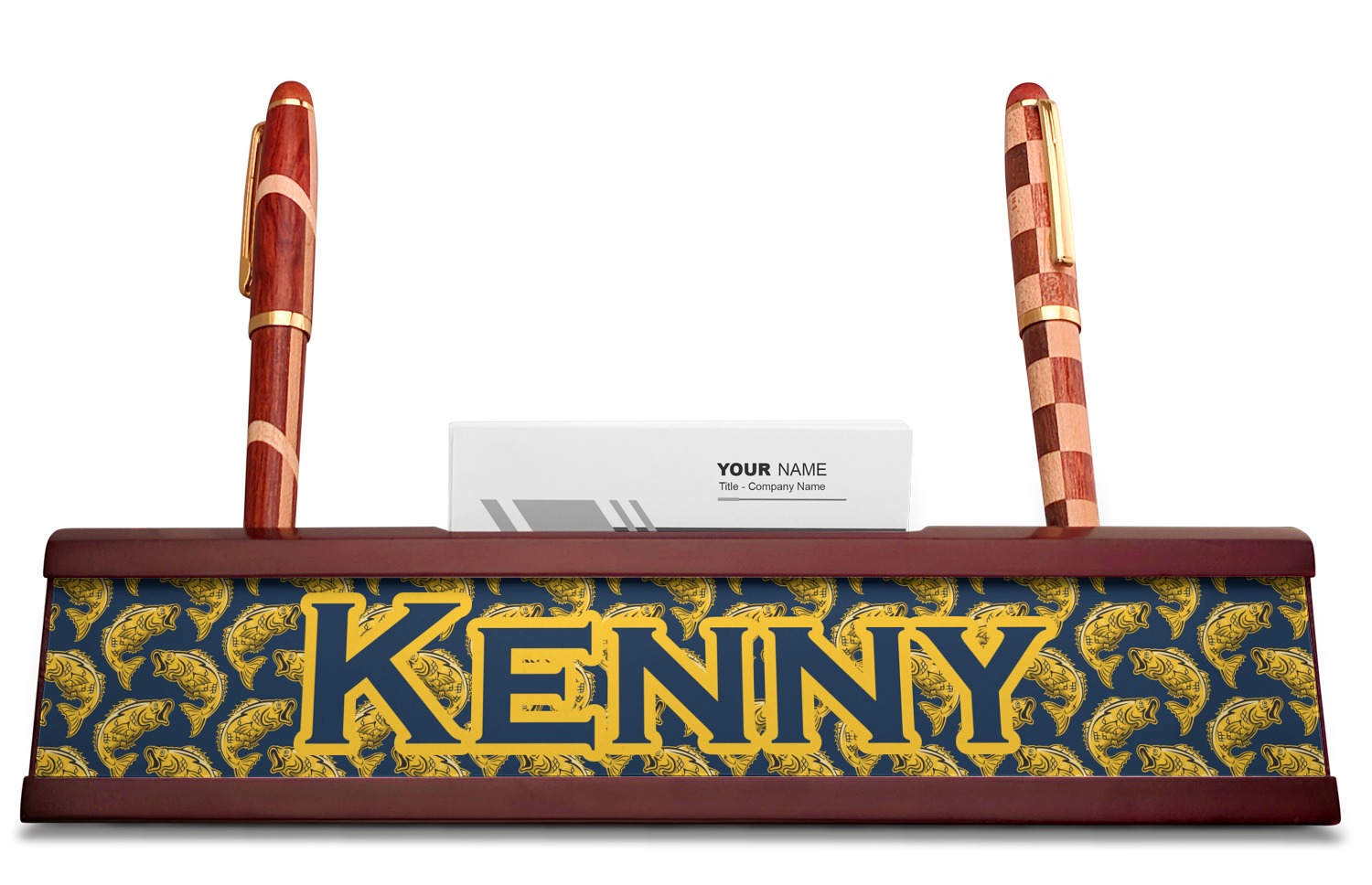 Your desk name plates are crafted from a high-quality, dark-cherry mahogany. At approximately 9.5 by 1.875 by 2.5 inches, this name plaque will fit perfectly, front and center, on your desk. Your customization spans across the entire face of the nameplate. Behind the nameplate lies a skinny slot that can fit approximately 15, traditionally-sized, business cards. You can also store your writing utensils on either side of this custom desk name plate.
