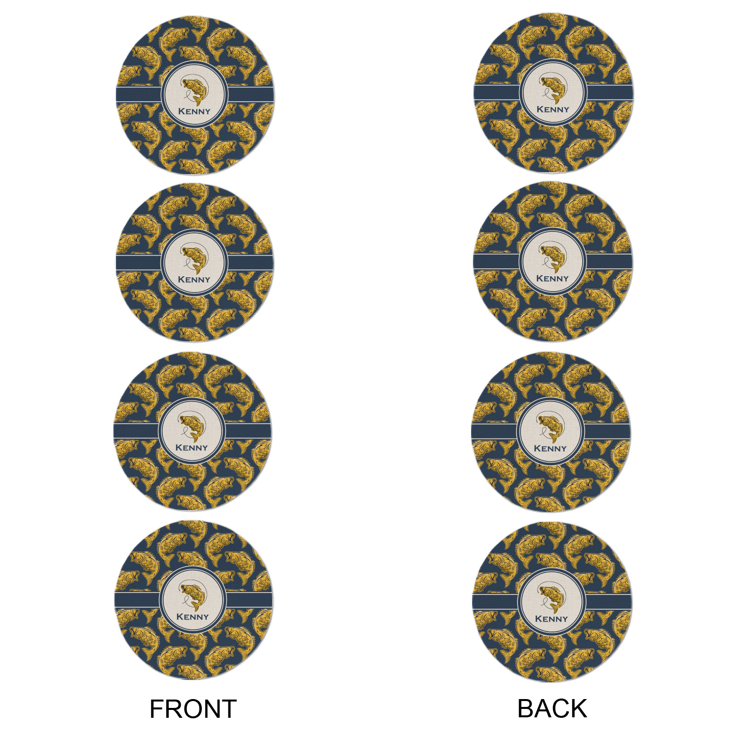 This Fish Design is perfect for all the fishermen in your life. The design is shown with yellow fish on a navy blue background. However, both the background and fish colors can be changed Through the center of the design, there is ribbon with a label. The label contains a fish and hook graphic, but this graphic can be changed to a different fish or other graphic. Just like the fish and background, the ribbon and label color can be customized.
