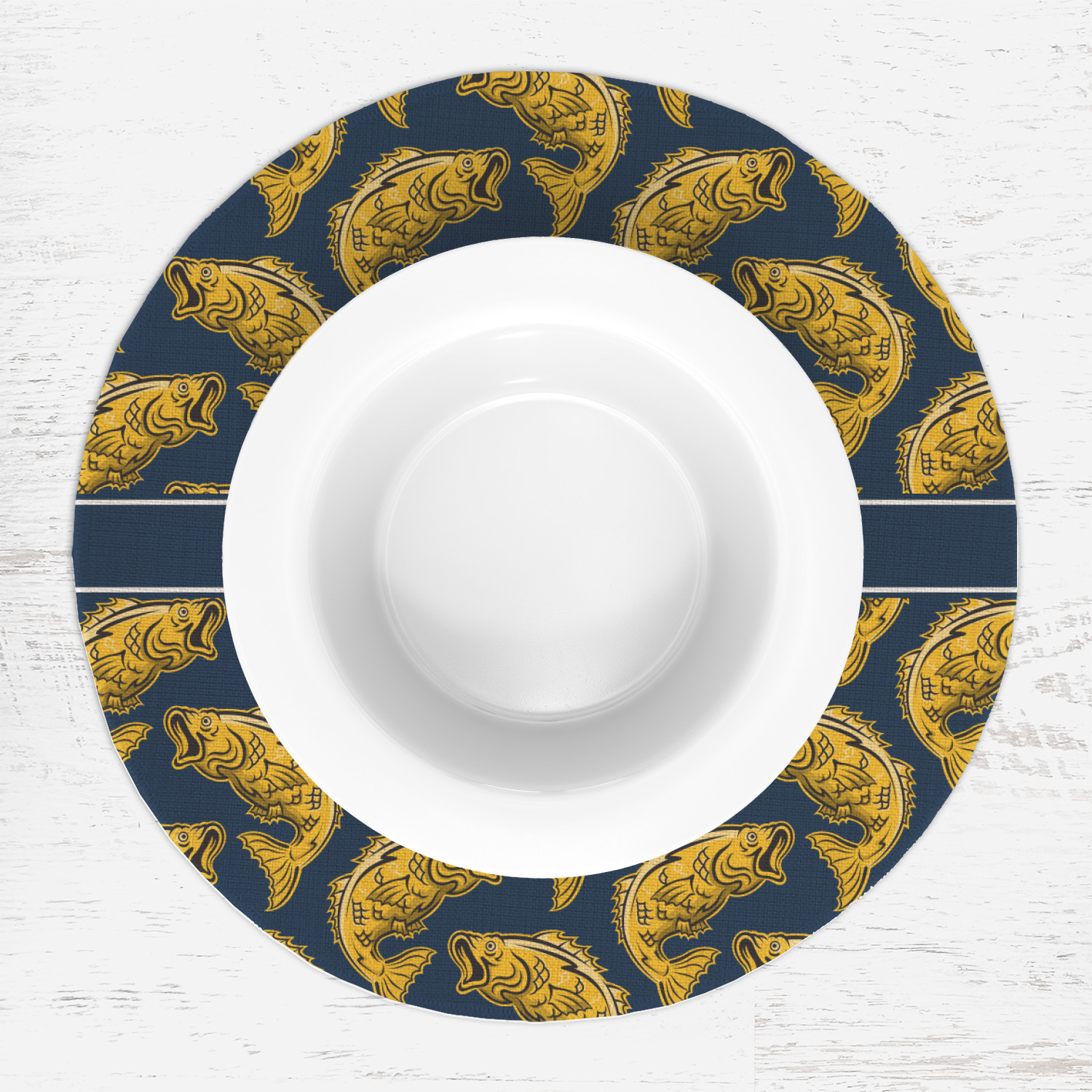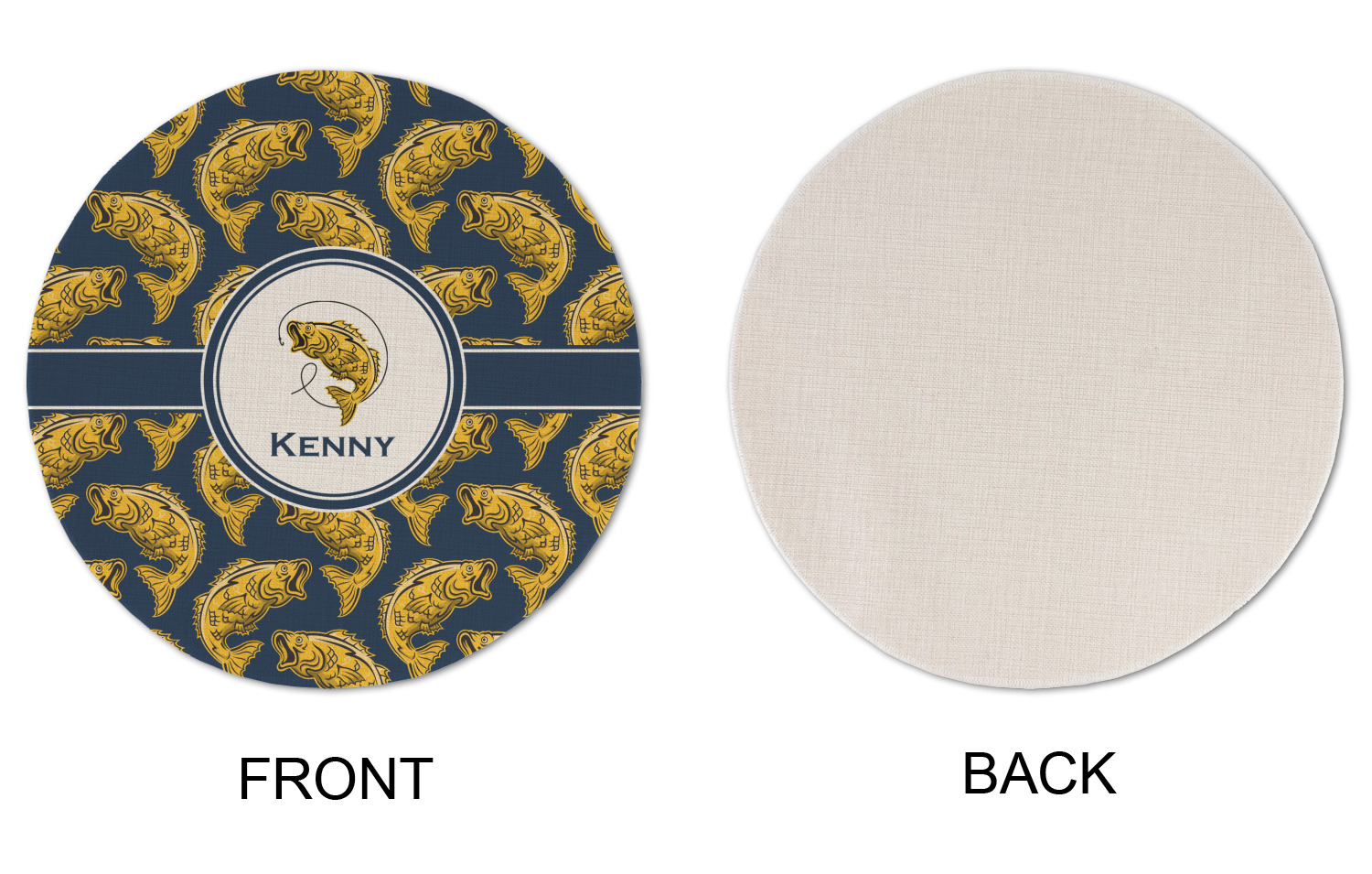 This Fish Design is perfect for all the fishermen in your life. The design is shown with yellow fish on a navy blue background. However, both the background and fish colors can be changed Through the center of the design, there is ribbon with a label. The label contains a fish and hook graphic, but this graphic can be changed to a different fish or other graphic. Just like the fish and background, the ribbon and label color can be customized.