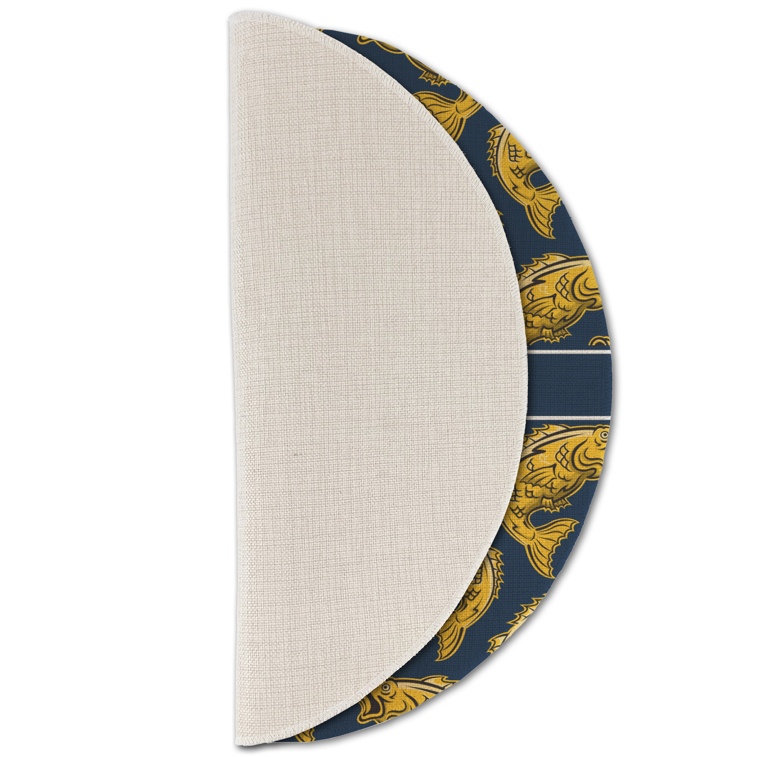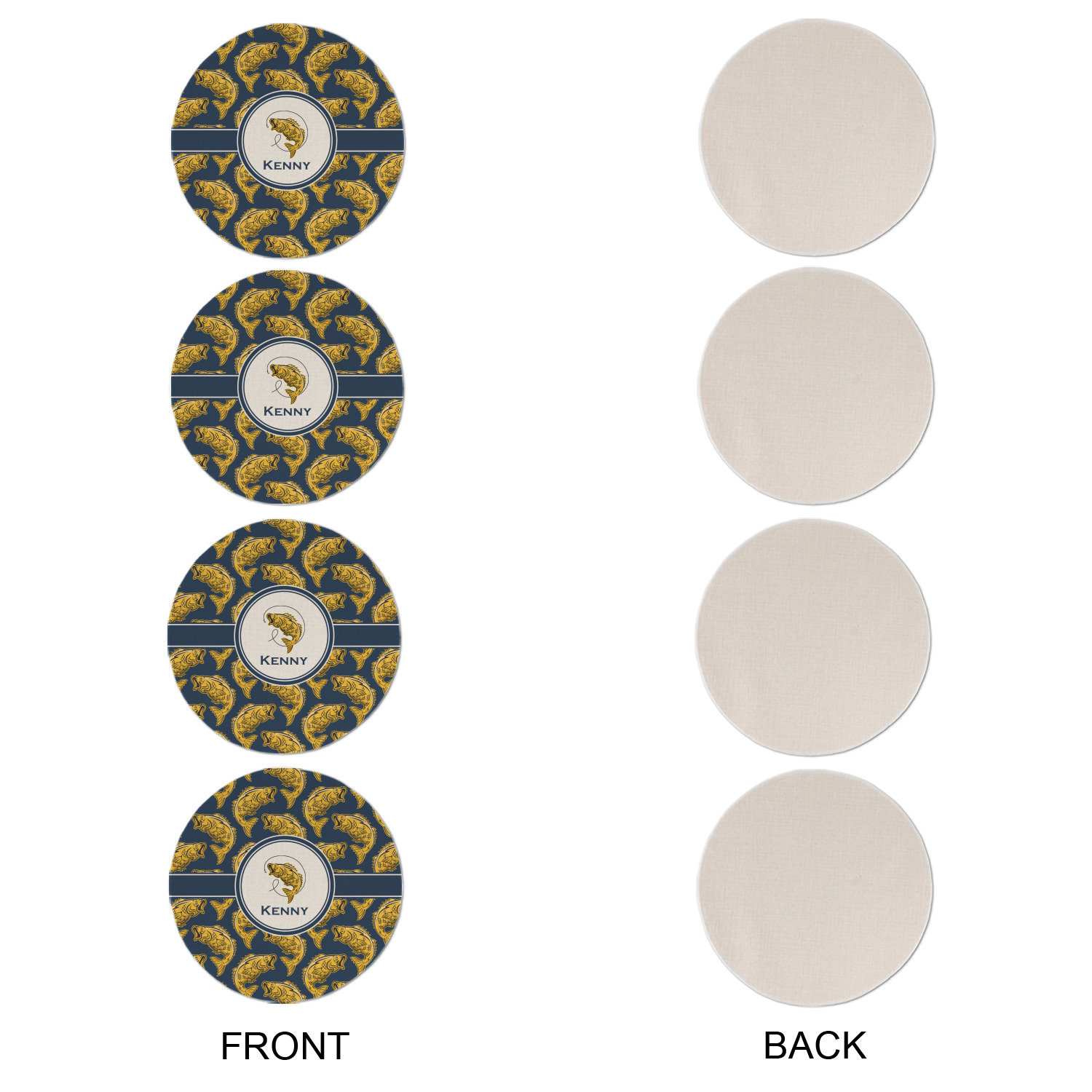 This Fish Design is perfect for all the fishermen in your life. The design is shown with yellow fish on a navy blue background. However, both the background and fish colors can be changed Through the center of the design, there is ribbon with a label. The label contains a fish and hook graphic, but this graphic can be changed to a different fish or other graphic. Just like the fish and background, the ribbon and label color can be customized.