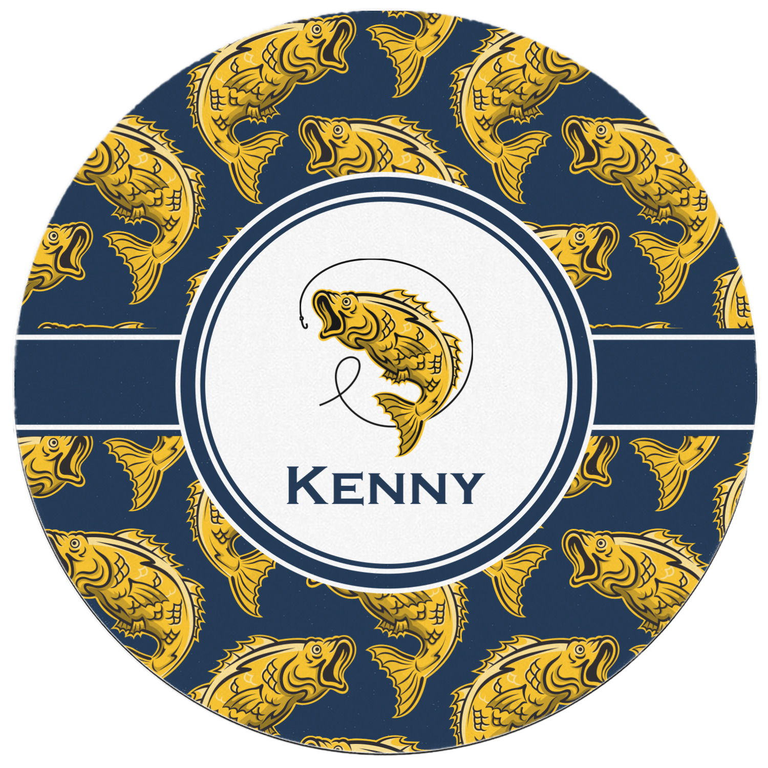 This Fish Design is perfect for all the fishermen in your life. The design is shown with yellow fish on a navy blue background. However, both the background and fish colors can be changed Through the center of the design, there is ribbon with a label. The label contains a fish and hook graphic, but this graphic can be changed to a different fish or other graphic. Just like the fish and background, the ribbon and label color can be customized.