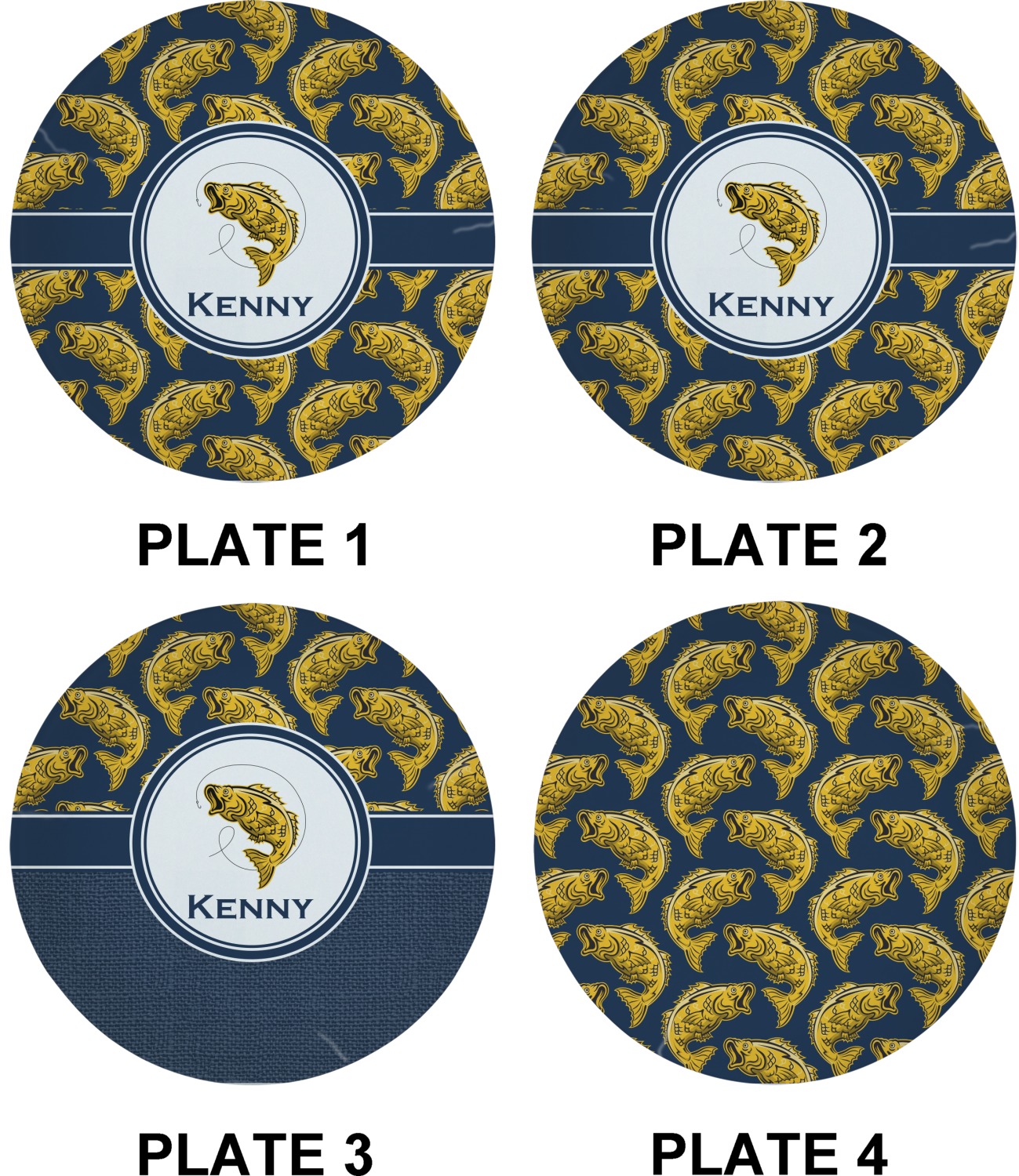 This Fish Design is perfect for all the fishermen in your life. The design is shown with yellow fish on a navy blue background. However, both the background and fish colors can be changed Through the center of the design, there is ribbon with a label. The label contains a fish and hook graphic, but this graphic can be changed to a different fish or other graphic. Just like the fish and background, the ribbon and label color can be customized.