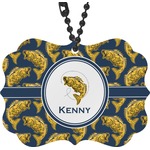 This Fish Design is perfect for all the fishermen in your life. The design is shown with yellow fish on a navy blue background. However, both the background and fish colors can be changed Through the center of the design, there is ribbon with a label. The label contains a fish and hook graphic, but this graphic can be changed to a different fish or other graphic. Just like the fish and background, the ribbon and label color can be customized.