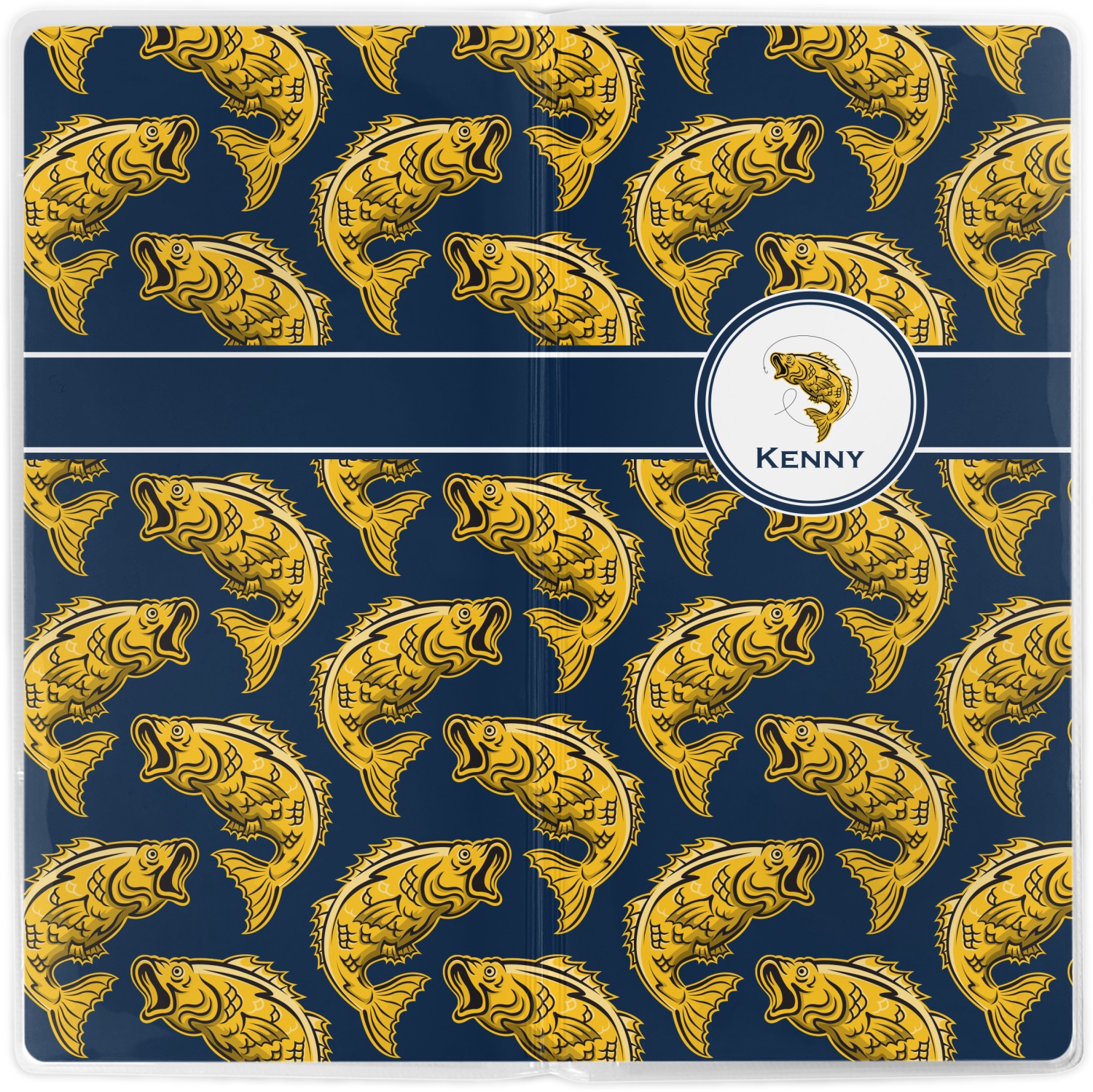 This Fish Design is perfect for all the fishermen in your life. The design is shown with yellow fish on a navy blue background. However, both the background and fish colors can be changed Through the center of the design, there is ribbon with a label. The label contains a fish and hook graphic, but this graphic can be changed to a different fish or other graphic. Just like the fish and background, the ribbon and label color can be customized.