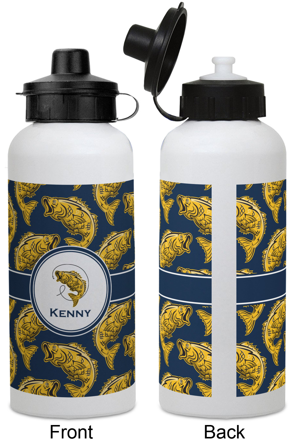 This Fish Design is perfect for all the fishermen in your life. The design is shown with yellow fish on a navy blue background. However, both the background and fish colors can be changed Through the center of the design, there is ribbon with a label. The label contains a fish and hook graphic, but this graphic can be changed to a different fish or other graphic. Just like the fish and background, the ribbon and label color can be customized.