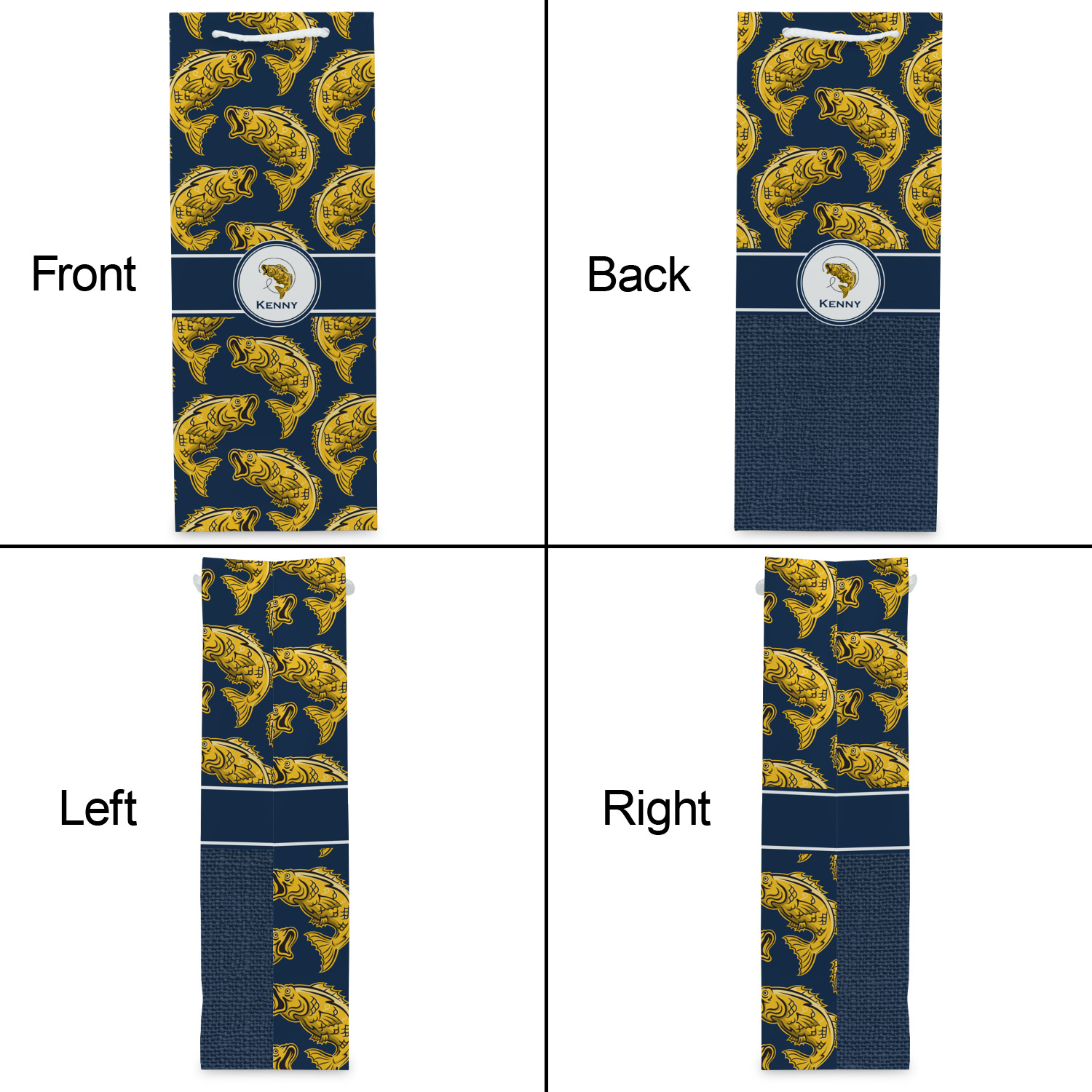This Fish Design is perfect for all the fishermen in your life. The design is shown with yellow fish on a navy blue background. However, both the background and fish colors can be changed Through the center of the design, there is ribbon with a label. The label contains a fish and hook graphic, but this graphic can be changed to a different fish or other graphic. Just like the fish and background, the ribbon and label color can be customized.