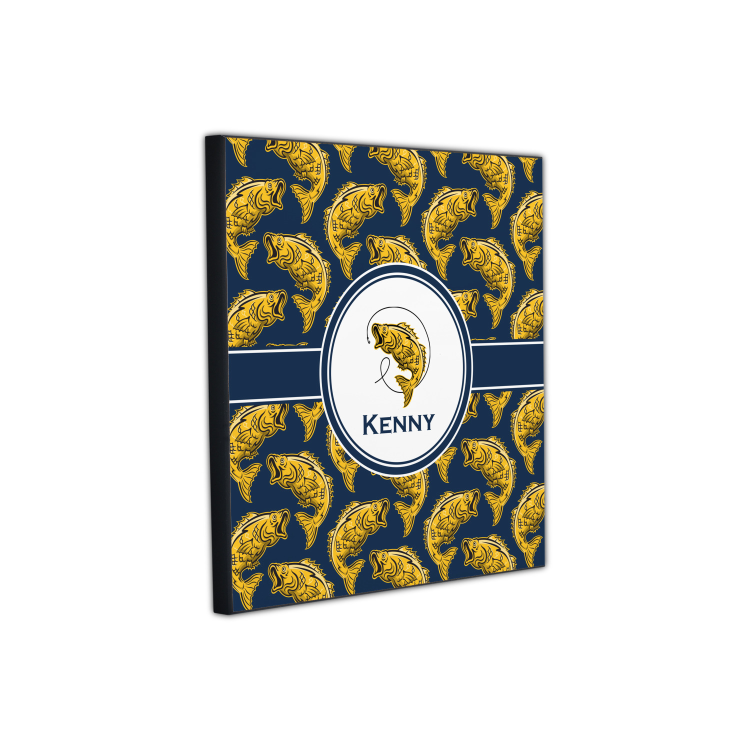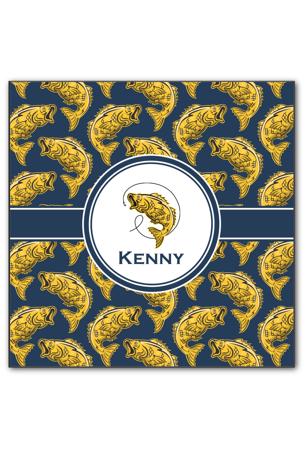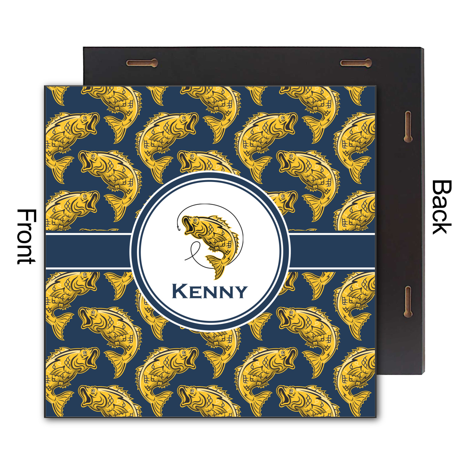 This Fish Design is perfect for all the fishermen in your life. The design is shown with yellow fish on a navy blue background. However, both the background and fish colors can be changed Through the center of the design, there is ribbon with a label. The label contains a fish and hook graphic, but this graphic can be changed to a different fish or other graphic. Just like the fish and background, the ribbon and label color can be customized.