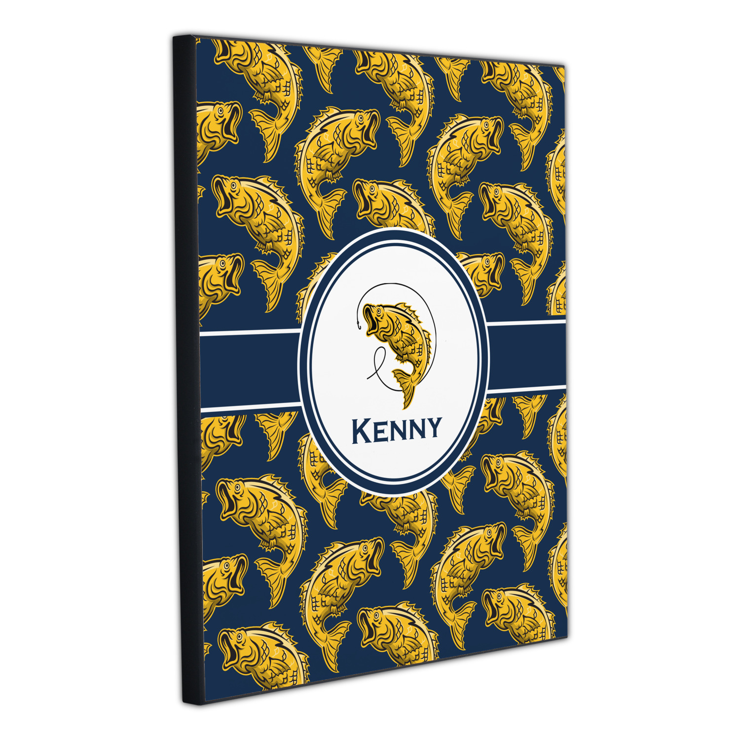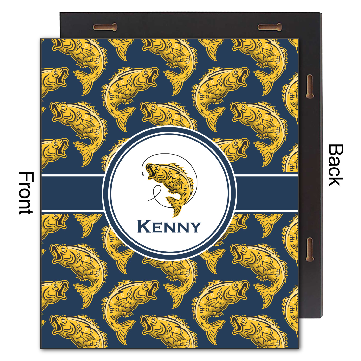 This Fish Design is perfect for all the fishermen in your life. The design is shown with yellow fish on a navy blue background. However, both the background and fish colors can be changed Through the center of the design, there is ribbon with a label. The label contains a fish and hook graphic, but this graphic can be changed to a different fish or other graphic. Just like the fish and background, the ribbon and label color can be customized.