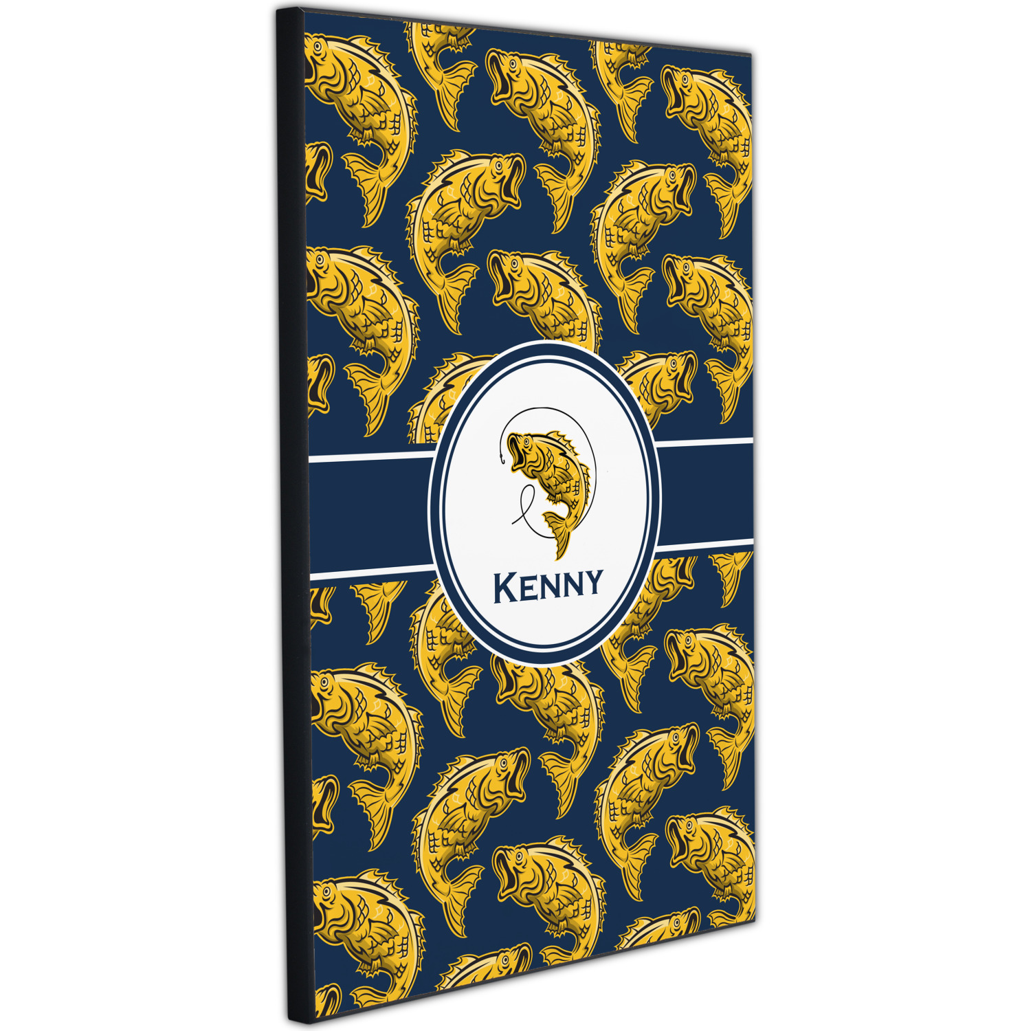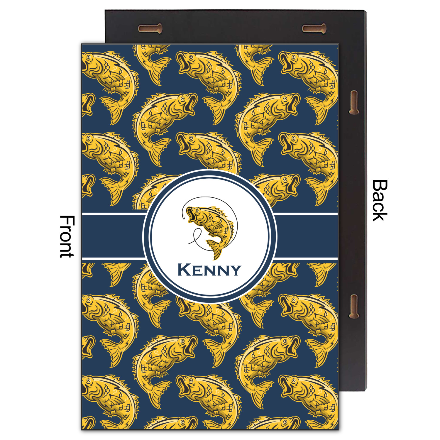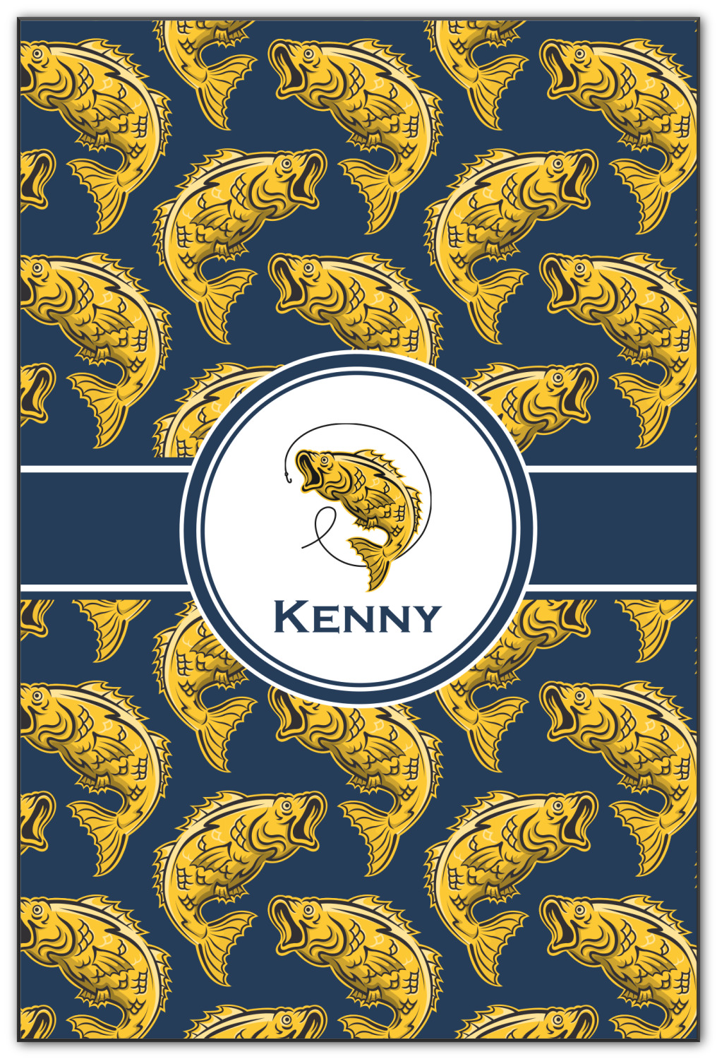 This Fish Design is perfect for all the fishermen in your life. The design is shown with yellow fish on a navy blue background. However, both the background and fish colors can be changed Through the center of the design, there is ribbon with a label. The label contains a fish and hook graphic, but this graphic can be changed to a different fish or other graphic. Just like the fish and background, the ribbon and label color can be customized.
