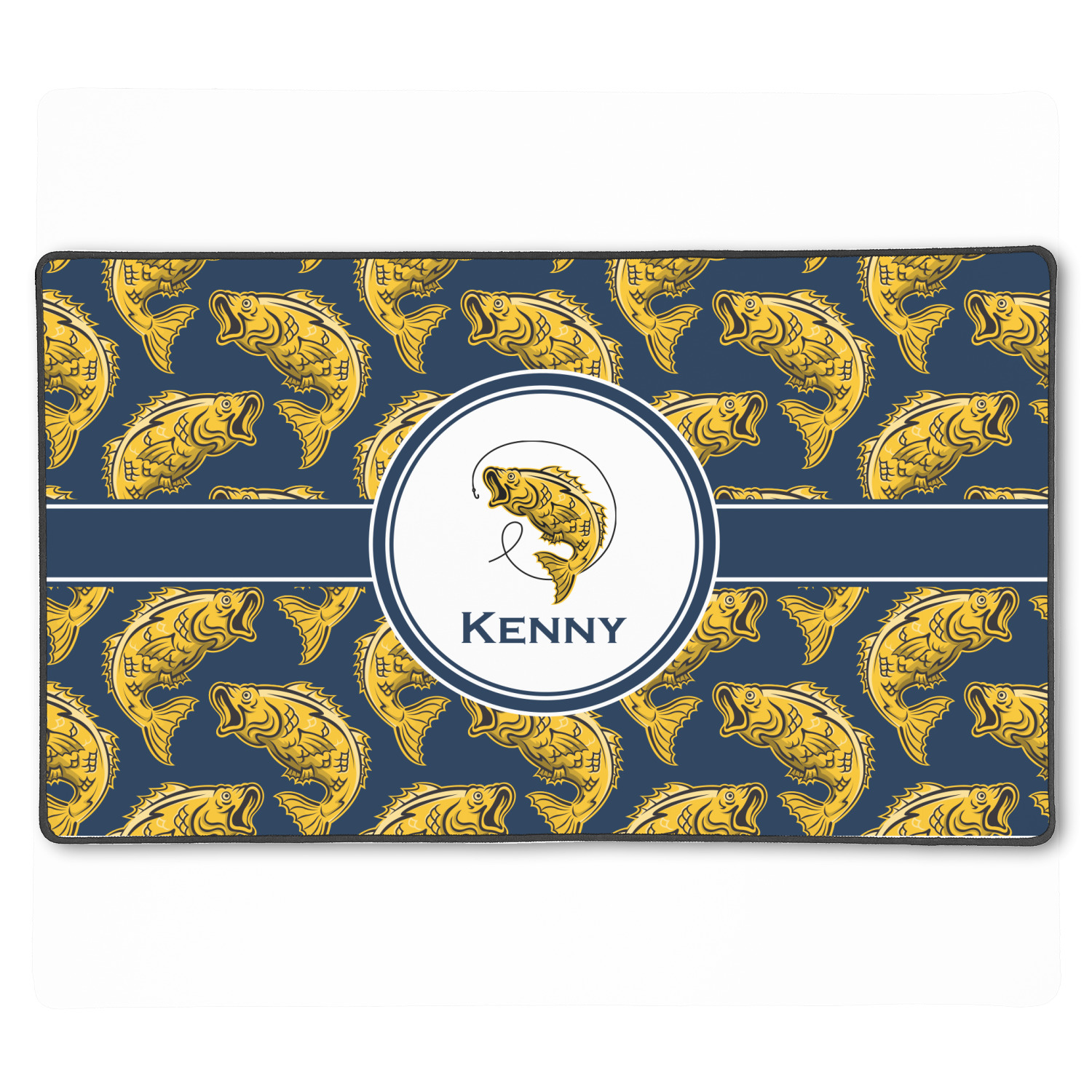 This Fish Design is perfect for all the fishermen in your life. The design is shown with yellow fish on a navy blue background. However, both the background and fish colors can be changed Through the center of the design, there is ribbon with a label. The label contains a fish and hook graphic, but this graphic can be changed to a different fish or other graphic. Just like the fish and background, the ribbon and label color can be customized.