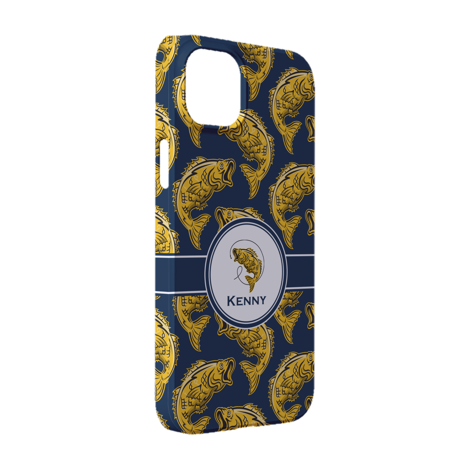 This Fish Design is perfect for all the fishermen in your life. The design is shown with yellow fish on a navy blue background. However, both the background and fish colors can be changed Through the center of the design, there is ribbon with a label. The label contains a fish and hook graphic, but this graphic can be changed to a different fish or other graphic. Just like the fish and background, the ribbon and label color can be customized.