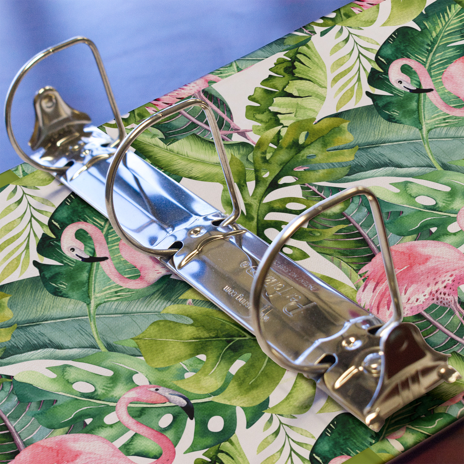 The outside is printed in 3 sections - front cover, spine and back cover - while the inside is printed in a full single print of your choice. The inside boasts a high quality nickel plated binder mechanism with a trigger opening function and is secured to the cardboard binder with posts and screws.