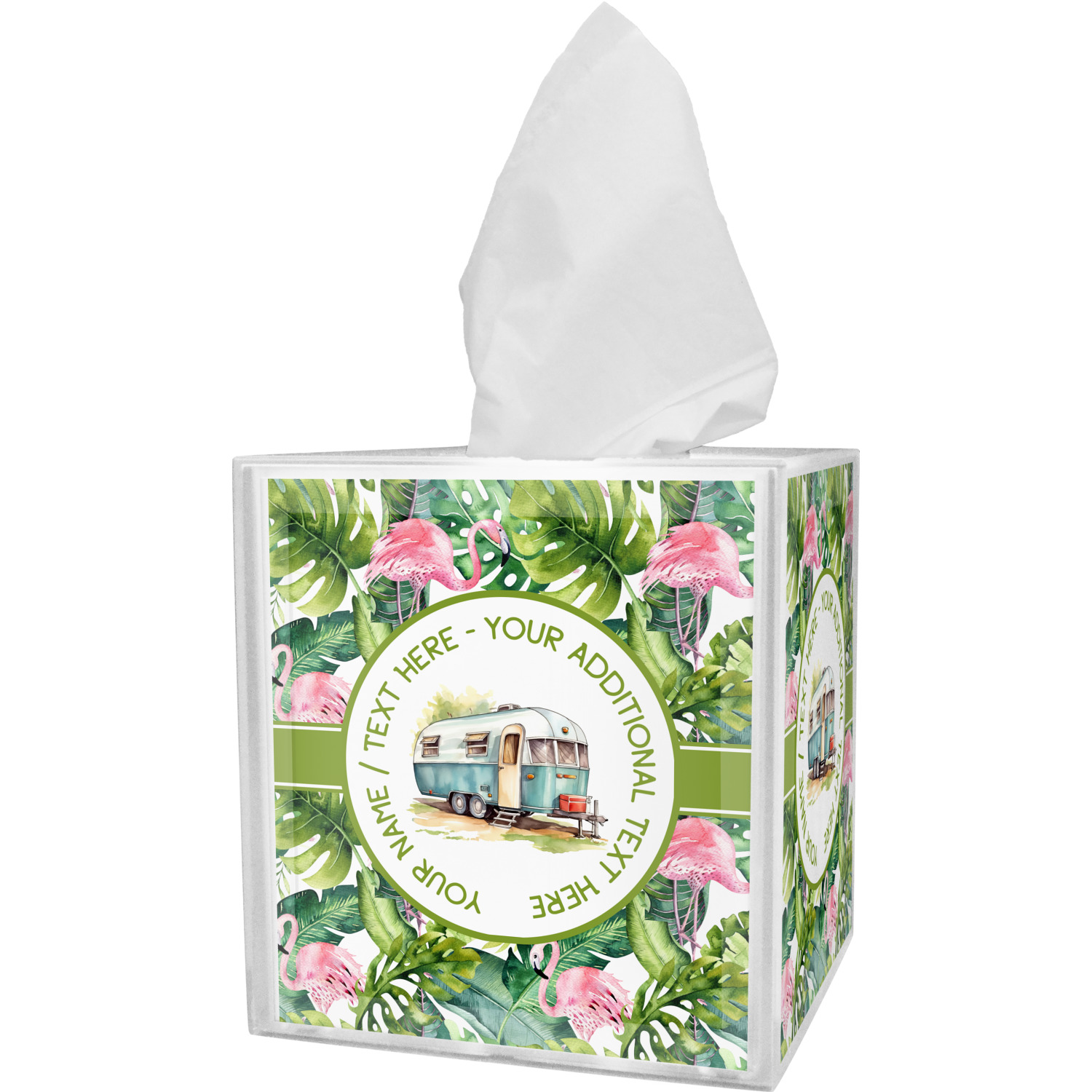 These tissue holders are built from durable acrylic and display your unique personalization on fine-quality vinyl inserts placed within the four sides and top. The box features two pieces, allowing you to easily switch out tissue boxes. On the sides, you'll find ridges that ensure the top and base fit securely in place. The bottom of these tissue box holders has four, rubber, non-slip pads to prevent the box from scuffing any surface you decide to display it on. Each box can fit a standard 5-by-5-inch box of tissues.