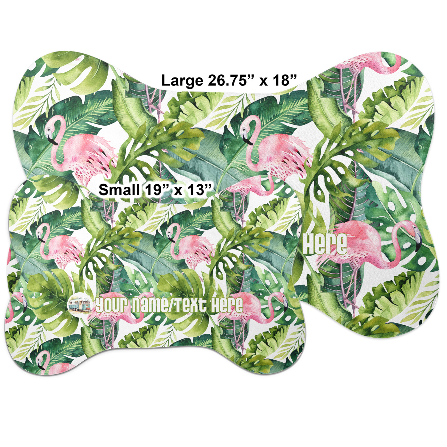 The top of this mat displays your custom design, as it is printed on polyester. To prevent slippage, the underside of the mat is made of rubber. We offer a small dog food mat, suitable for smaller dogs and a large dog food mat for bigger breeds. The small dog food mat is approximately 19 by 13 inches, while the large dog feeding mat measures at approximately 26.75 by 18 inches. Both personalized mats are ideally sized to fit two dog bowls.