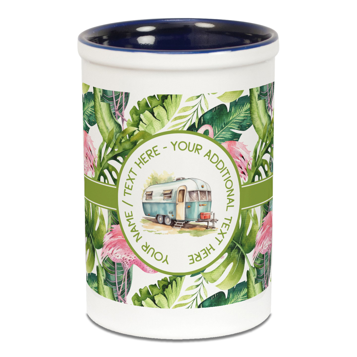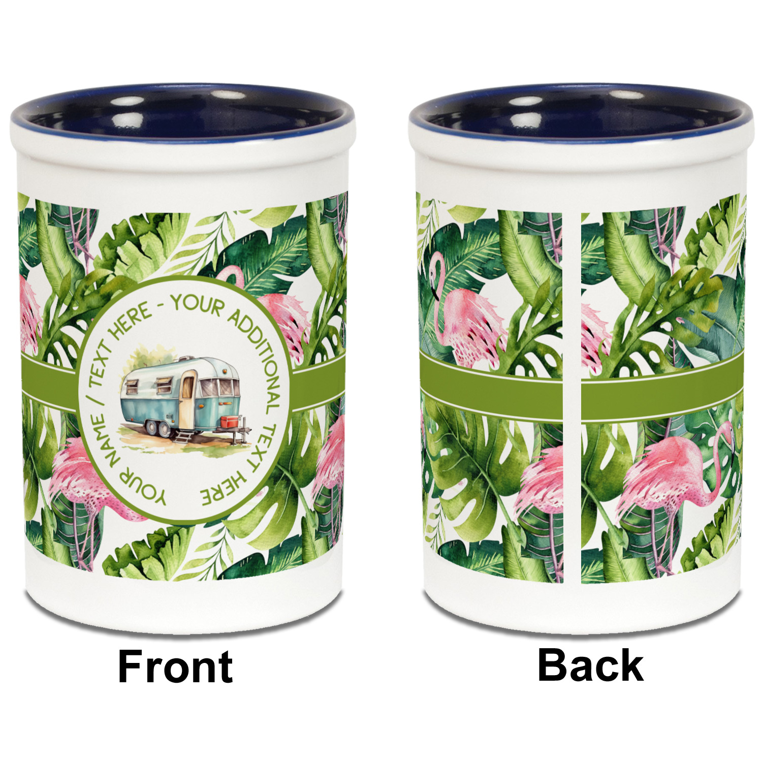 Both the blue and black pencil holders are a ceramic material, giving you a sturdy and long-lasting pen and pencil holder. We print your designs on the exterior of the pencil cup, covering most of the outside surface. There is a small white border on the top and bottom of the exterior of the pen holder, setting apart your design from the interior's color. Our ceramic pen caddy is roughly 3.5" x 3.5" x 5" in dimensions.