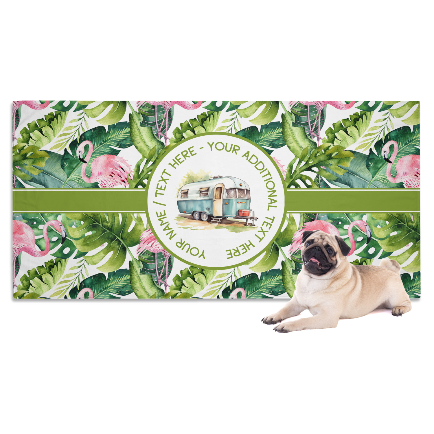 Our custom towels are crafted from a special blend of polyester and polyamide, which contributes to its lightweight, yet thoroughly absorbent nature. We craft it as such to guarantee efficiency as a convenient product; its lightweight nature makes it easy to roll up and carry along, yet it is still able to dry off even the wettest, muddiest pet. It measures at 60" x 30" and is sizable enough to dry off even the largest of pets. With our towel's gentle, soft-to-the-touch material, your pet will be sure to anticipate its warm, dry embrace. We print your personalized design on the front of the towel, while the back is white.