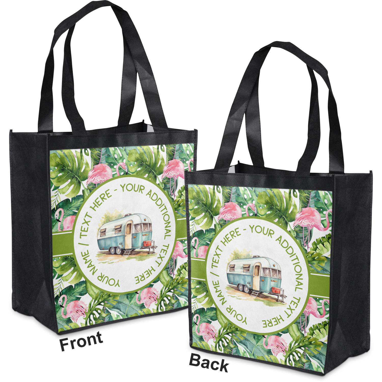 Made from a durable, biodegradable material, these reusable shopping bags can support up to 30 pounds of weight. With two large handles, measuring at 8.5 inches each, these personalized tote bags are easy to carry to your vehicle or home. The bag itself is 12 by 13.5 inches, and can expand to a depth of 7 inches. Your customization is printed on both the front and back, while the remaining sides, trim, and handle are a sleek, charcoal black.