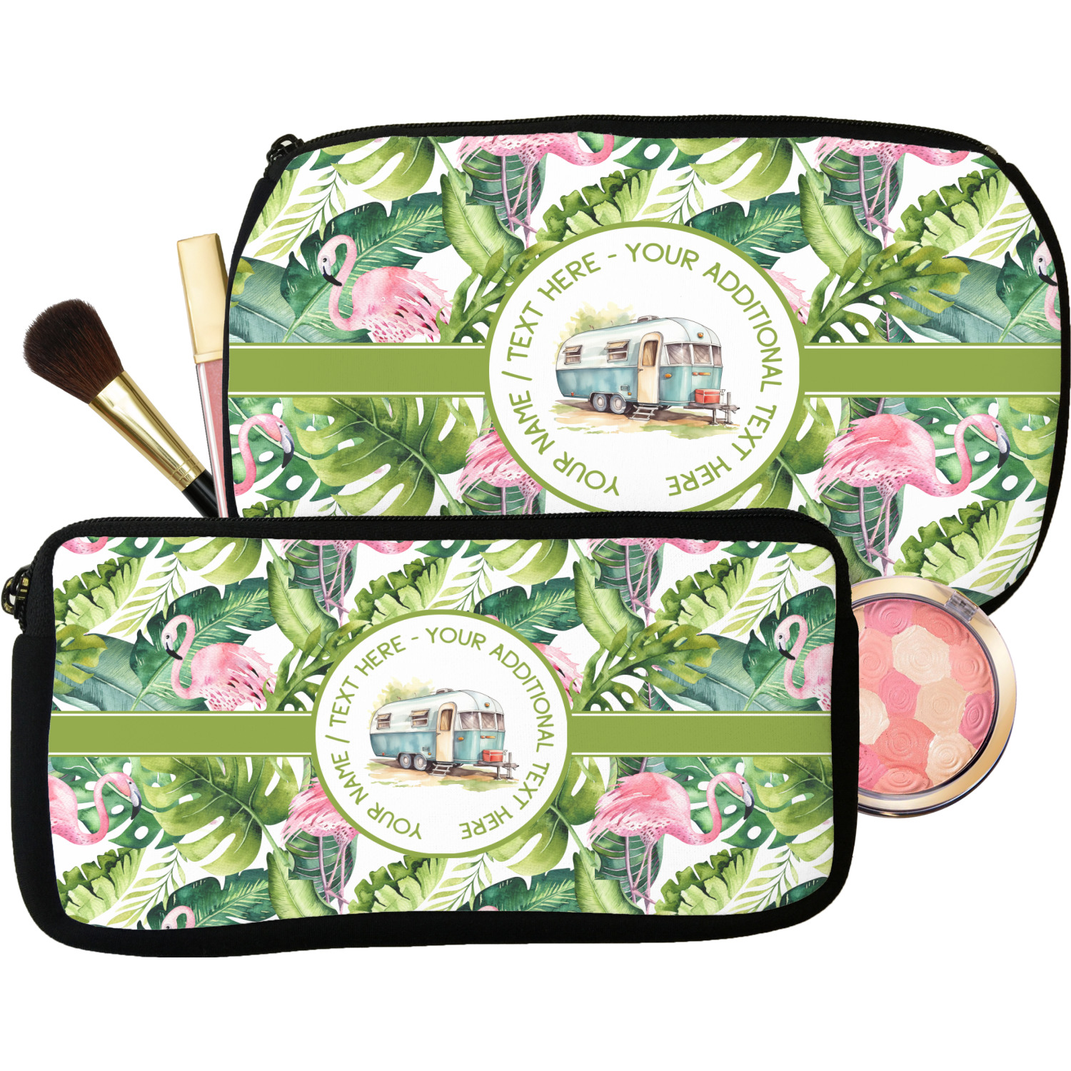 Our personalized makeup bags are available in many different designs, patterns and colors - so you are sure to find one that will love. They are made of neoprene (same material as wet-suits) and thus are water resistant, so spillages in your makeup bag will not end up all over you purse. They are customized on one side and are black on the other side and the zipper is black as well.
