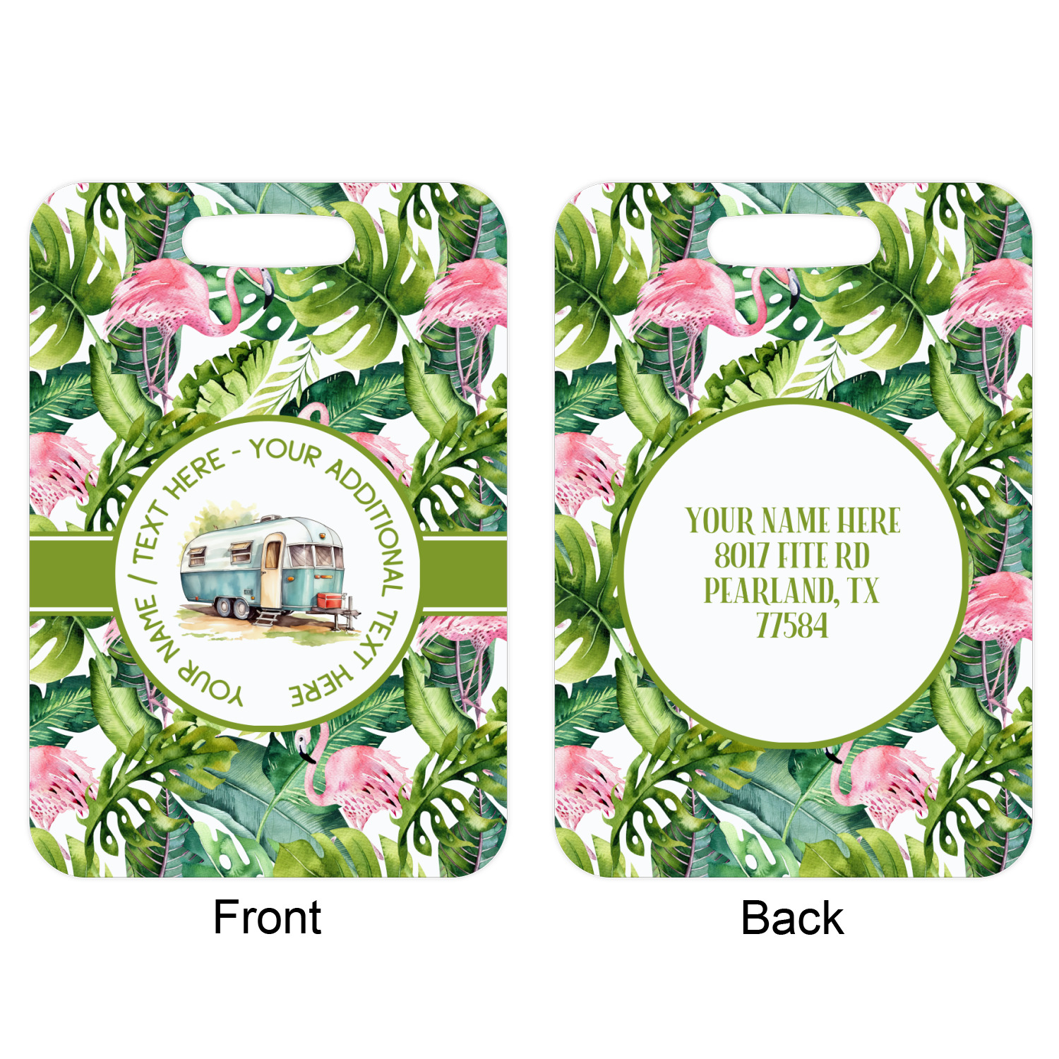 These metal luggage tags are printed on both sides; the front is printed with the design of your choice - and can be personalized with your name, name & initial or your monogram. The back can have as much or as little of your contact information as you desire - your name, your address, city, zip & state, you can also include your phone number and email address. Customize it exactly the way you want it!