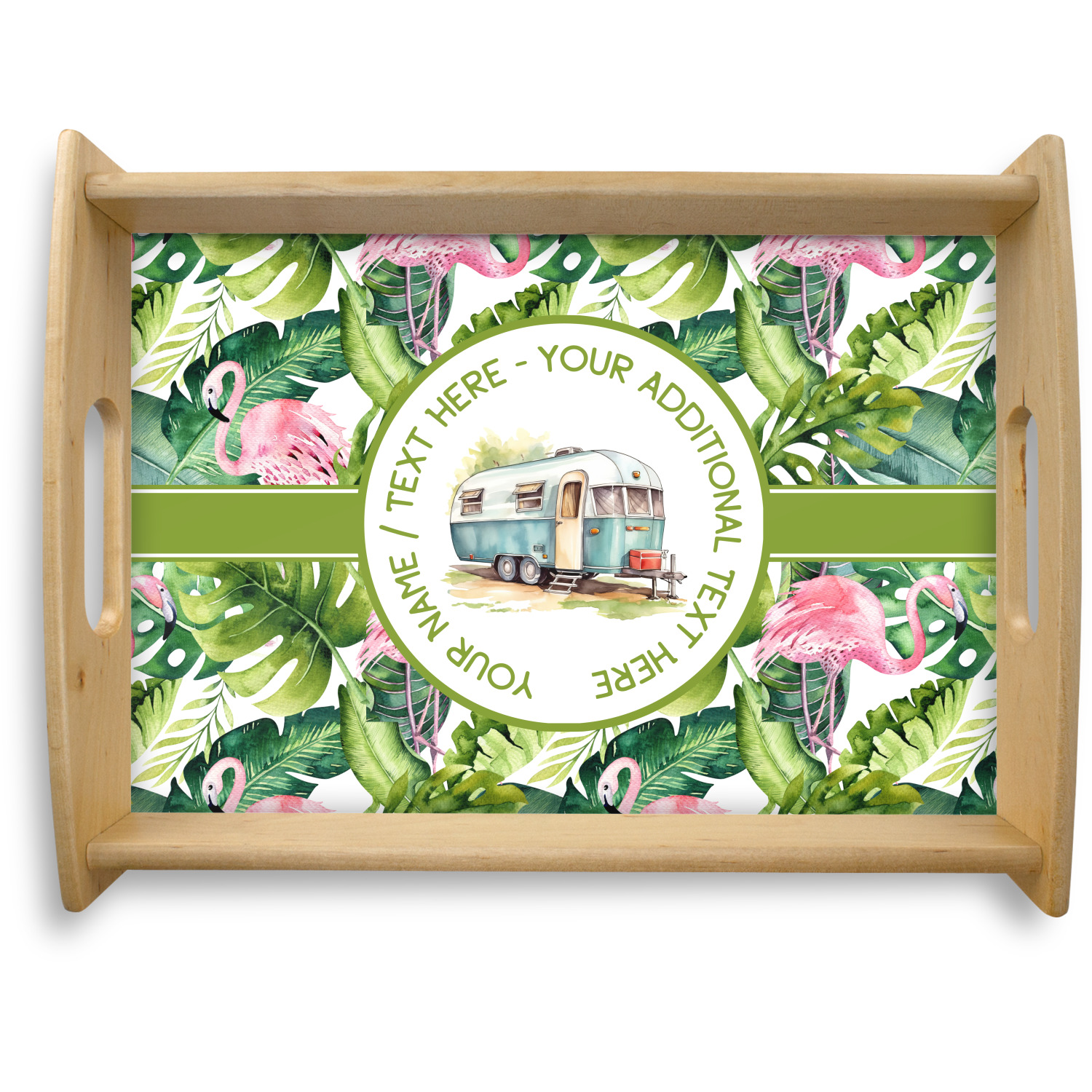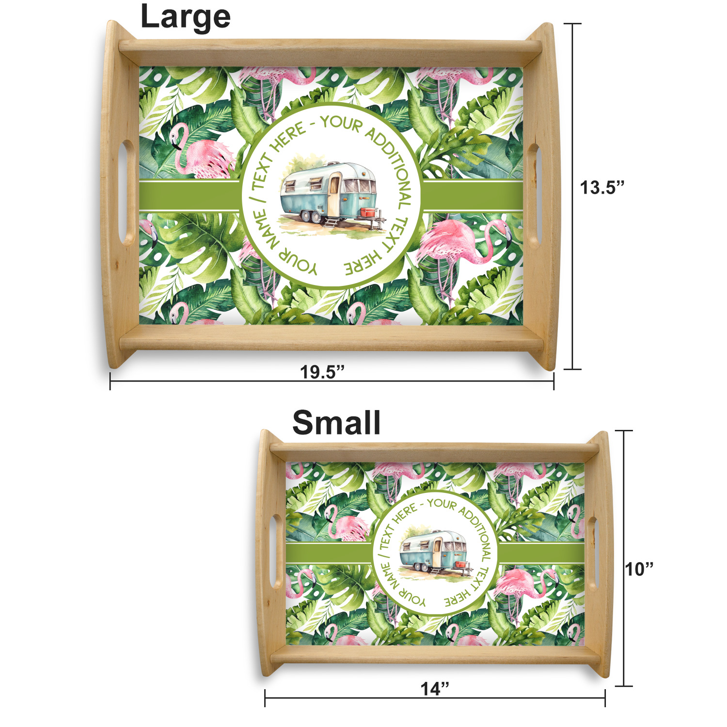 This serving tray with handles features square edges and two rounded sides, creating a very modern look. Each side is fabricated from a beautifully cut, natural wood. The bottom of the interior of the tray displays your customized design in bright, vibrant color. The tray is sold in both a black color and a natural wood look. Each variation of the wood serving tray has two sizes: Small, which is 14" x 10" x 2.25", and Large, which is 19.5" x 13.5" x 2.75".
