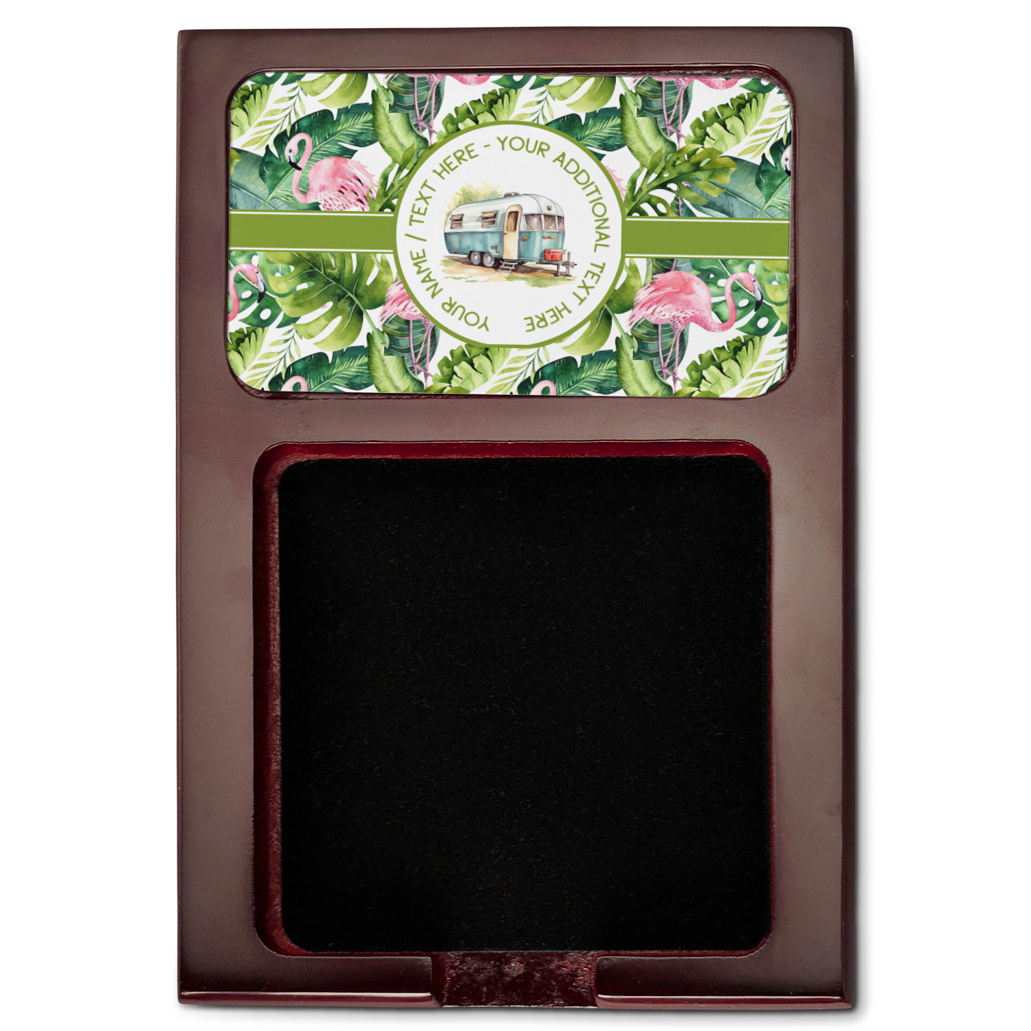 Crafted from a fine mahogany, this post it note holder is in the shade of a dark, cherry color. The dispenser itself is about 4.25 by 6.25 by 0.75 inches. You can place your 3 by 3 inch sticky notes in the indentation below the nameplate. We print your customization onto the nameplate that rests above the velvety indentation.