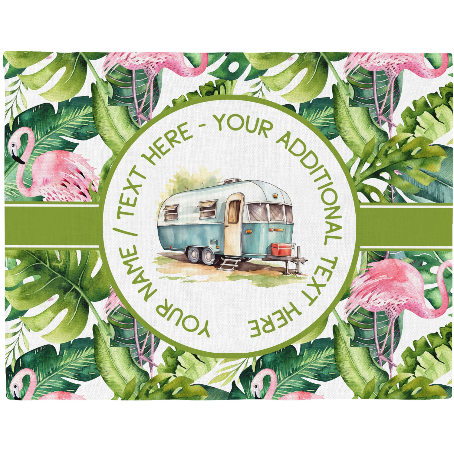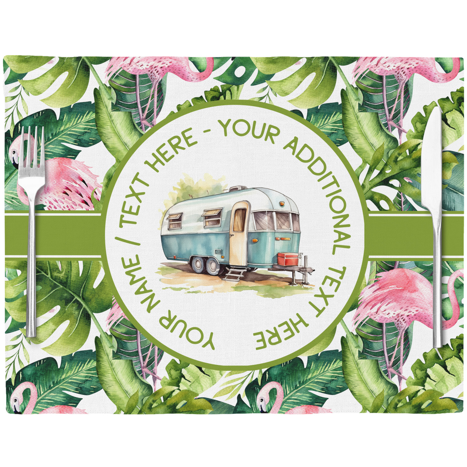 Each of our table mats are a poly twill material with woven burlap detailing. This creates a soft, quality placemat for us to fully print your personalized design across. The woven twill also adds a wrinkle-free surface to set your table! Each customizable placemat is a rectangle shape measuring at approximately 13 x 18 and printed here in the USA.