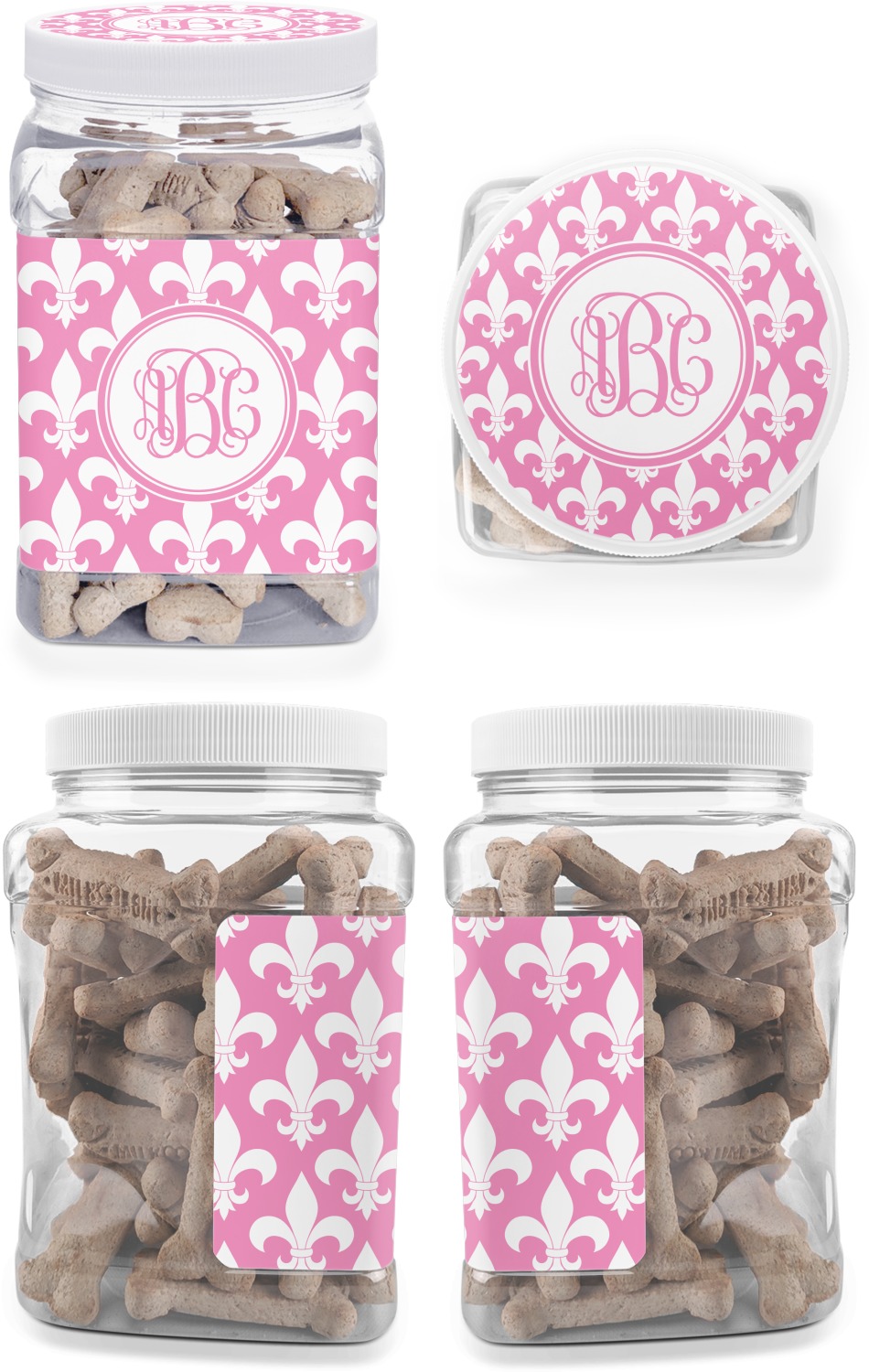 This half gallon jar, made from a sturdy plastic, is the perfect way to keep treats from any naughty pet paws, while still keeping them ready on hand for when your pup performs an impressive trick. This dog cookie jar features a screw-on, white lid that displays your personalized design on a vinyl sticker. We apply another customized sticker that wraps around the front and sides of the jar. Our dog treat jar also has indentations on the rear ends of the sides, which allows for convenient handling, and its square frame allows for easy storage.