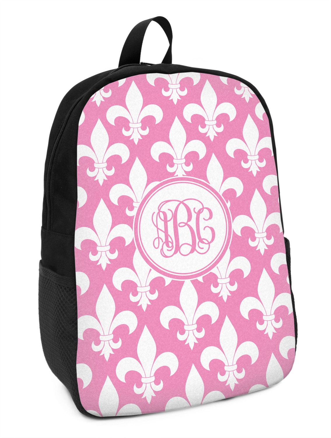 These small backpacks are made of a durable black canvas material with your personalization right on the front. The two shoulder straps are padded and easily adjustable. The bag itself measures at about 11" W x 15" H x 5" D. It's the perfect size for elementary aged kids or adults who want a smaller backpack. On the top of the bag you will find a handle to hang or carry your backpack by as well as a large zipper closure to keep all of your belongings safe inside. On each side of your backpack is a mesh pocket for a small item or water bottle. Inside your backpack you will find a spacious area with a small zipper pocket and a padded laptop slot that will fit up to a 13" laptop (13" being very snug). This is the perfect bag for any student that needs a couple books and their laptop with them at all times. It also works great as a carry on for traveling!
