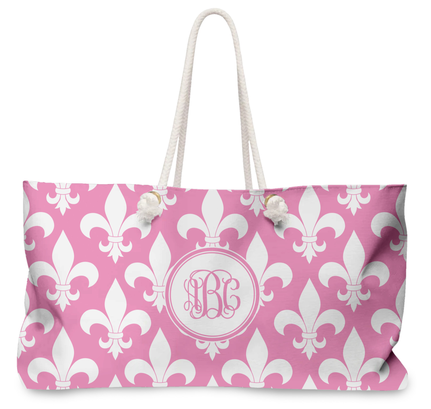 Our oversized weekender tote with rope handles is perfect for your weekend at the beach or on the town. This large tote are 24" W X 13" H, with a 5" gusset and a 27" thick rope handles with a knot that is put through a grommeted brass hole.