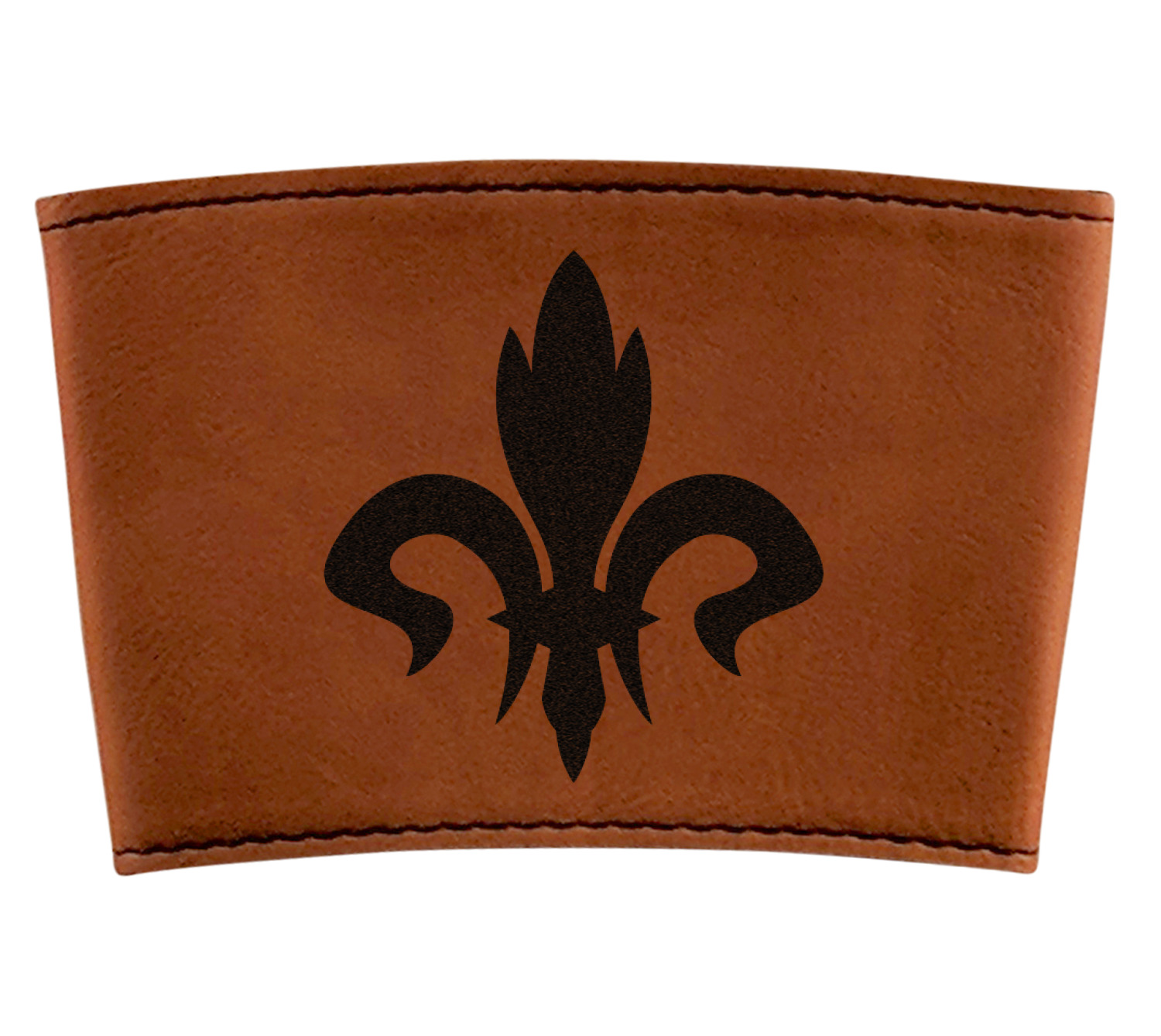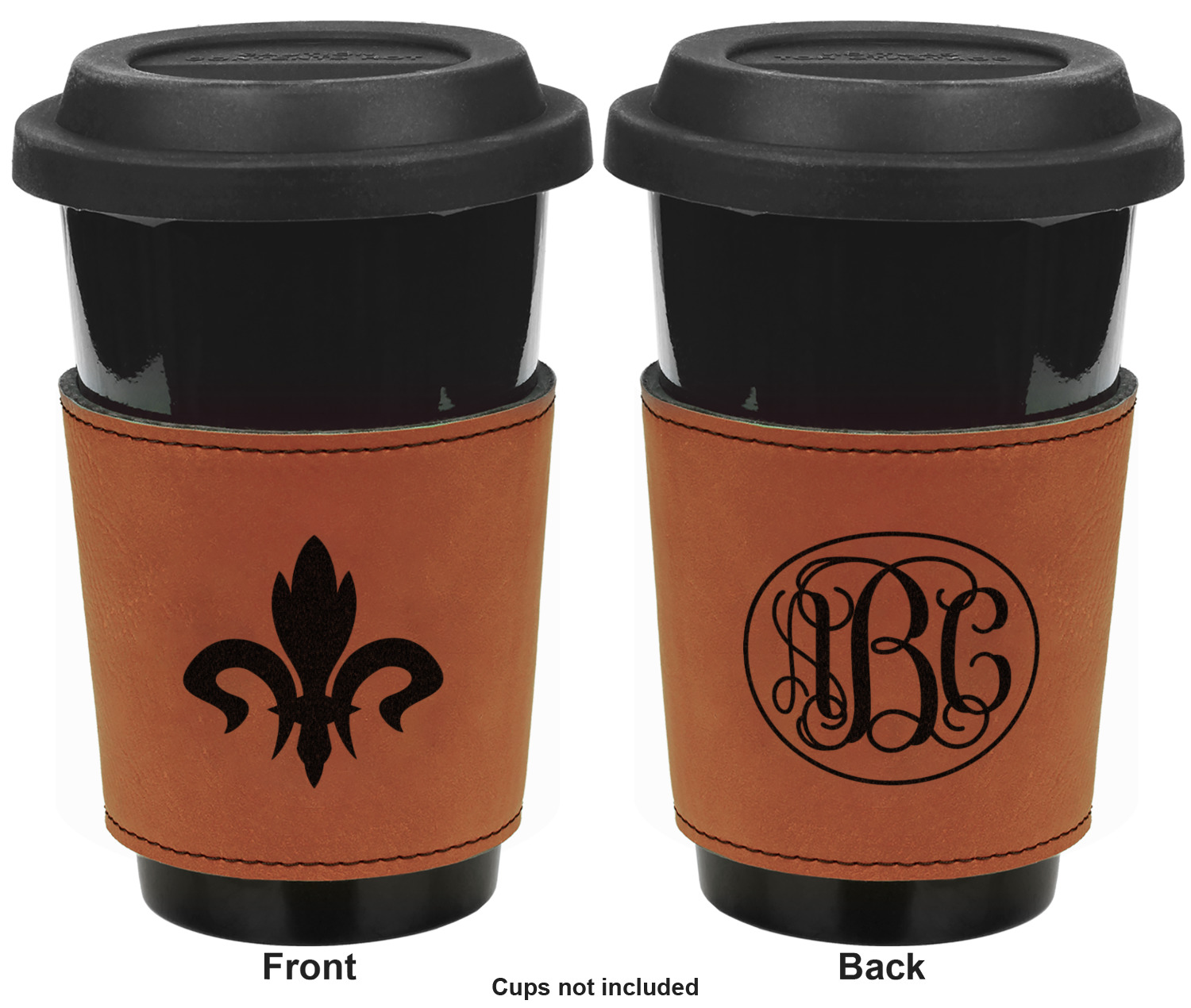 This cup sleeve is made from a suave, cognac-brown leatherette and finished with an intricate, black stitch. The interior of this can sleeve is fabricated from a thin foam material to help insulate your mug's contents. The sleeve is specifically made to suit tapered glasses or mugs, so the top's diameter is 3.5 inches, while the bottom's diameter is 2.75 inches. Your customized design will be laser engraved into the leatherette, leaving behind crisp, black imprint. With these products, we provide you with the option of engraving the front and back, or the front only.