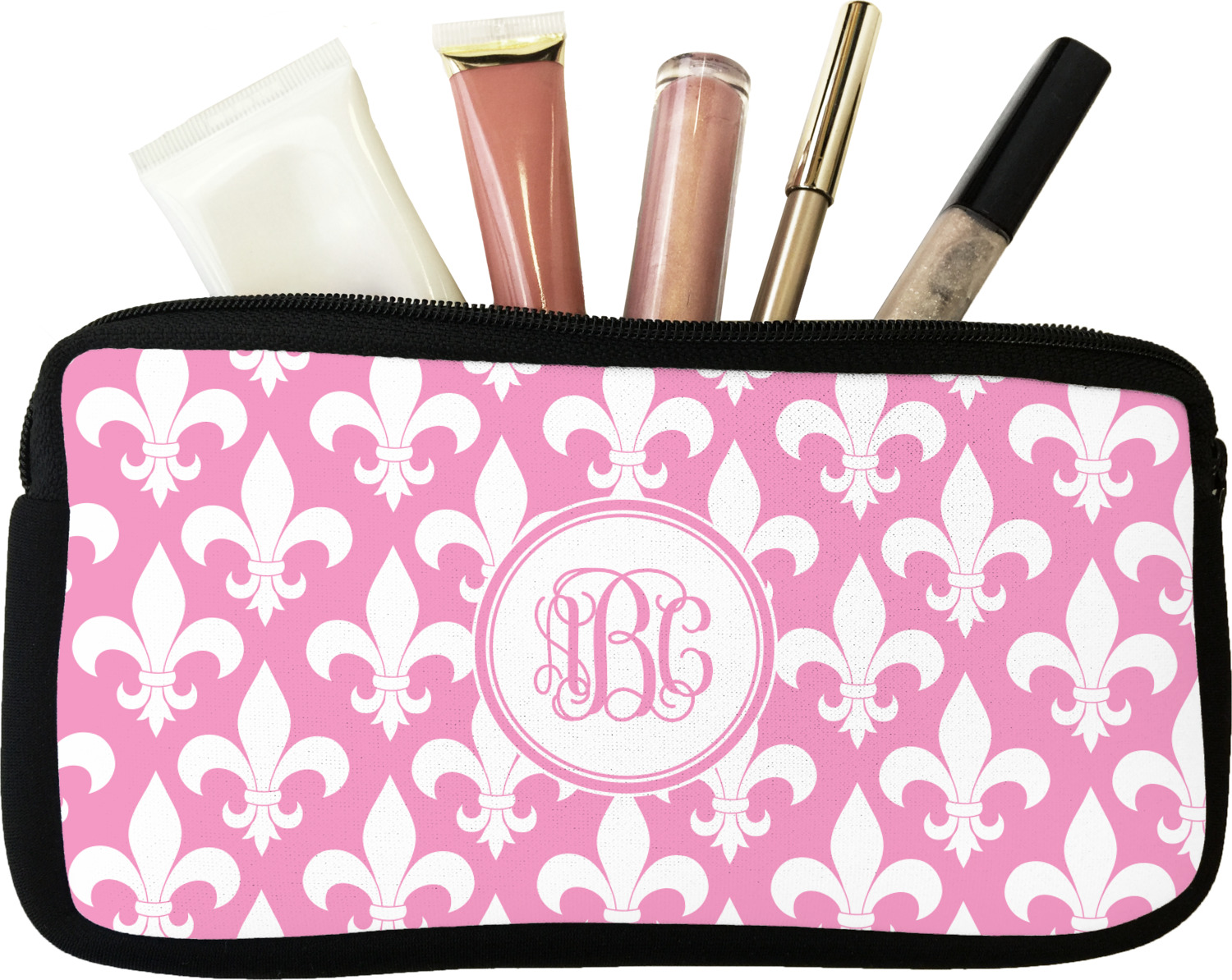 Our personalized makeup bags are available in many different designs, patterns and colors - so you are sure to find one that will love. They are made of neoprene (same material as wet-suits) and thus are water resistant, so spillages in your makeup bag will not end up all over you purse. They are customized on one side and are black on the other side and the zipper is black as well.