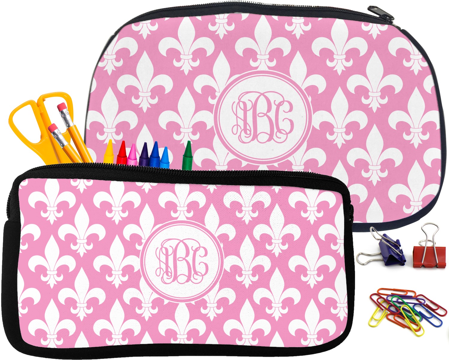 Built from durable neoprene, these pencil pouches, are water resistant, and prevent leaking ink from spilling into your backpack or purse. These custom pencil cases secure with a robust, black zipper. We print your personalized design on the front of this pouch, while the remaining sides a simple black color. These colored pencil cases [880] are sold in two sizes; our smaller version measures at 8.5 by 4.5 inches, while the medium measures at 10.5 by 6.5 inches. The smaller size is more suitable for holding pencils and pens, while our medium size can accommodate pencil sharpeners, scissors, and erasers.