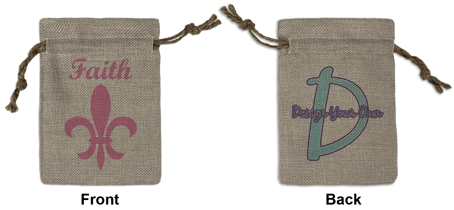 We sell our Burlap Gift Bags in 3 variant sized bags. Made with burlap polyester, each personalized bag can be secured with a twine drawstring pull. Your custom design is available to print on one side or both sides - completely up to you! The sizes of the bags measure approximately 4.5" x 6.5" for the smallest size, 6.5" x 8.0" for the medium size, and 6.5" x 13.5" for the large-sized bag.