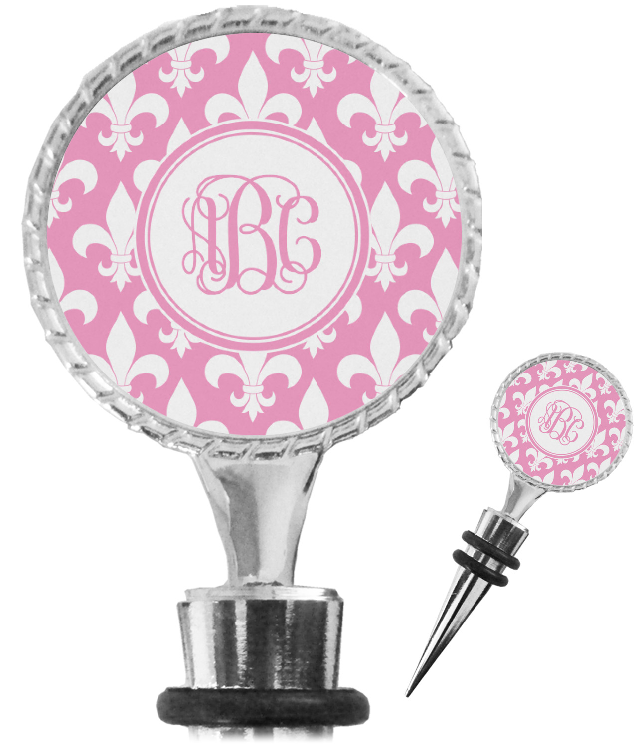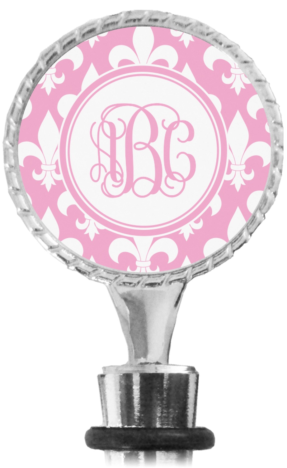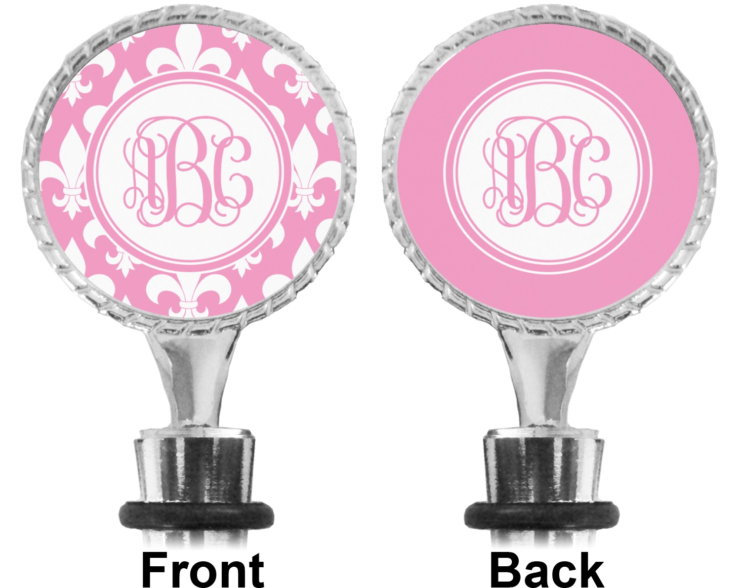 The top part of your bottle stopper is comprised of a zinc ring that displays your customization(s) in its middle, on both sides. The ring is heavy duty, with a bright chrome finish. The body of the wine stoppers have two silicone rings to provide an airtight seal. These wine bottle stoppers measure at 1.625" L x 0.8125" W x 4.625" H; your custom wine stopper is meant to fit into most standard-sized wine bottles.