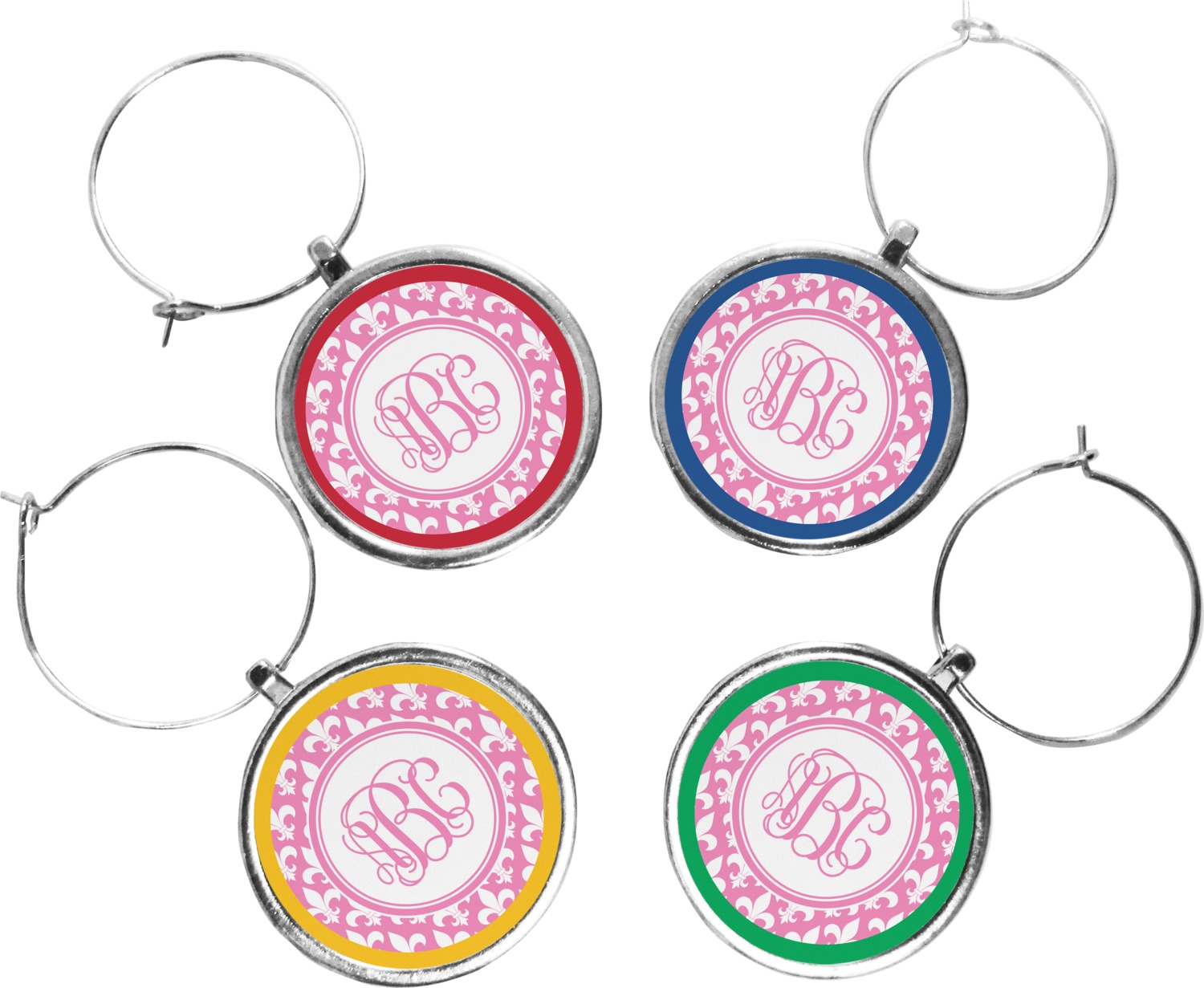 Your wine glass markers are comprised of a circular zinc plate with a 1.25 inch diameter. The zinc plate hangs from a zinc loop, which can be easily secured and removed from the stem of a wine glass. Your customized design is printed onto a 1 inch diameter insert, and then placed into the wine glass charm itself. Though sold in a set of four, you can personalize each charm individually and change the colors of the ring around your design, depending on your needs.