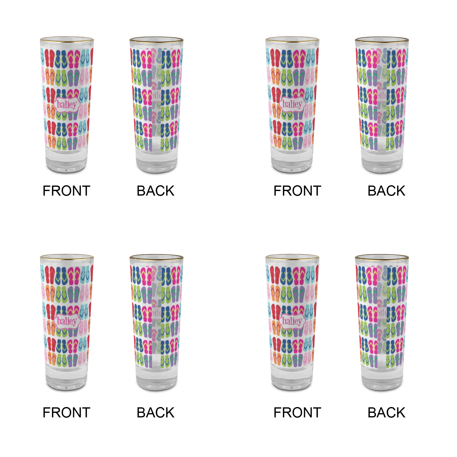 These glass shooter glasses are printed in full color with the design of your choice. These are a tall shooter 2 oz size and stand 4" tall. The print is a full wrap design to boldly display your personalization.