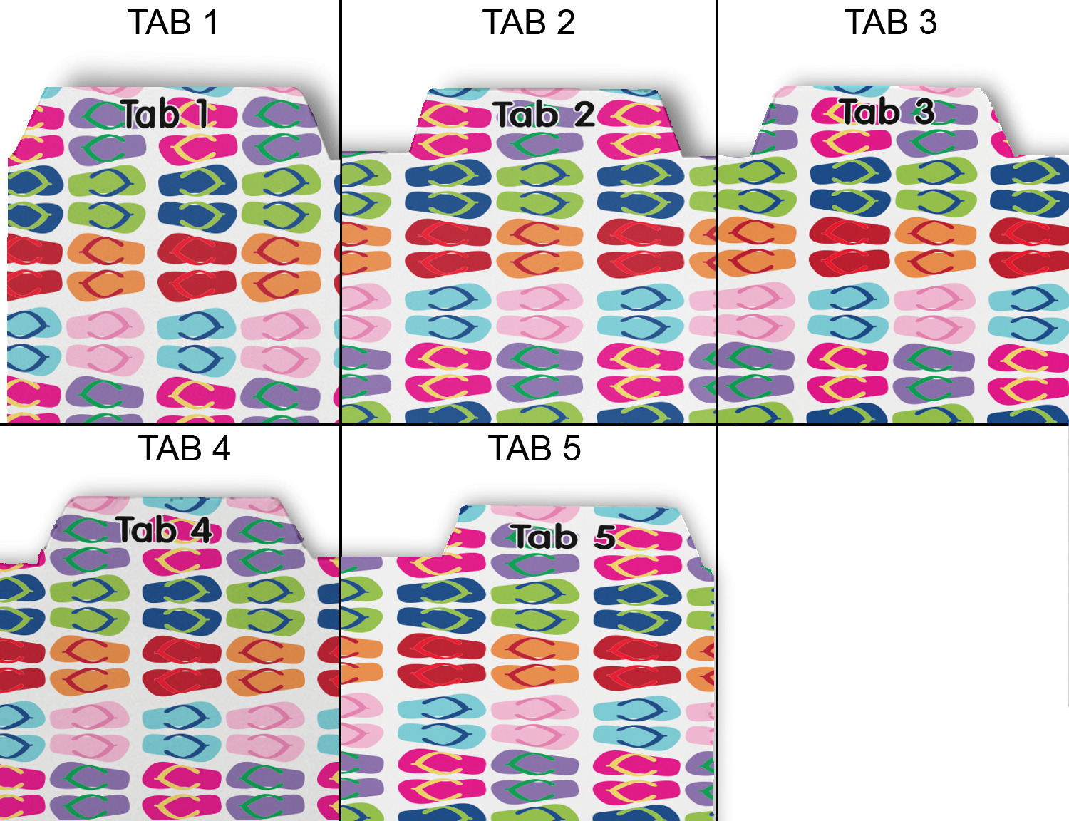 Whether you use binders at school or at work, we have designs to suit all of them. Available in 5 or 6 tab sets, you are sure to find a set to suit your needs. The back of each one is white and can be used to take notes, write vital information on, etc.