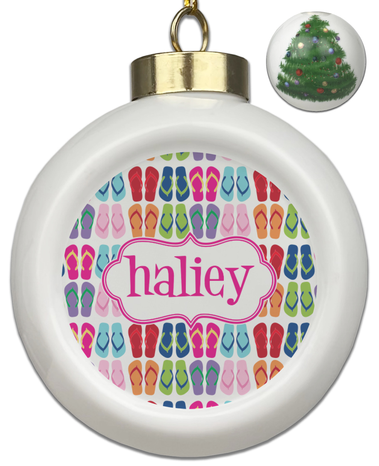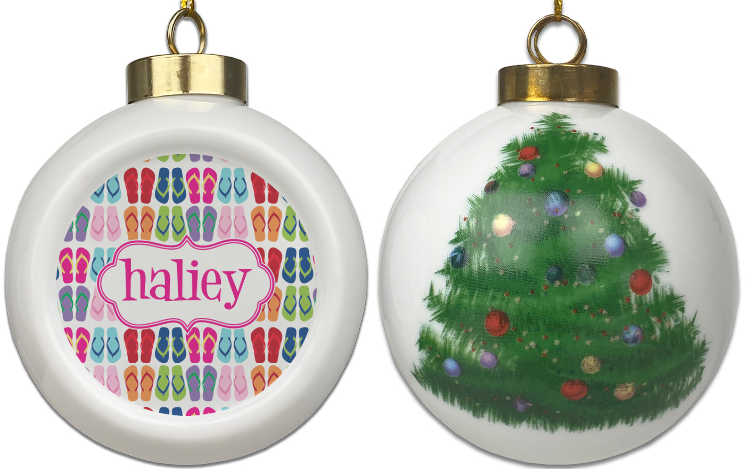 Our Christmas ornaments are a unique ceramic ball shape with a twist as it has a flat face to display your custom design! Select from one of our two design types - Christmas Tree or Poinsettia Garland - to adorn the curved back of your personal design. Each ornament measures 3H x 2.5W x 2D accompanied with a gold string accent for finishing touches to hang on your beautiful Christmas tree!