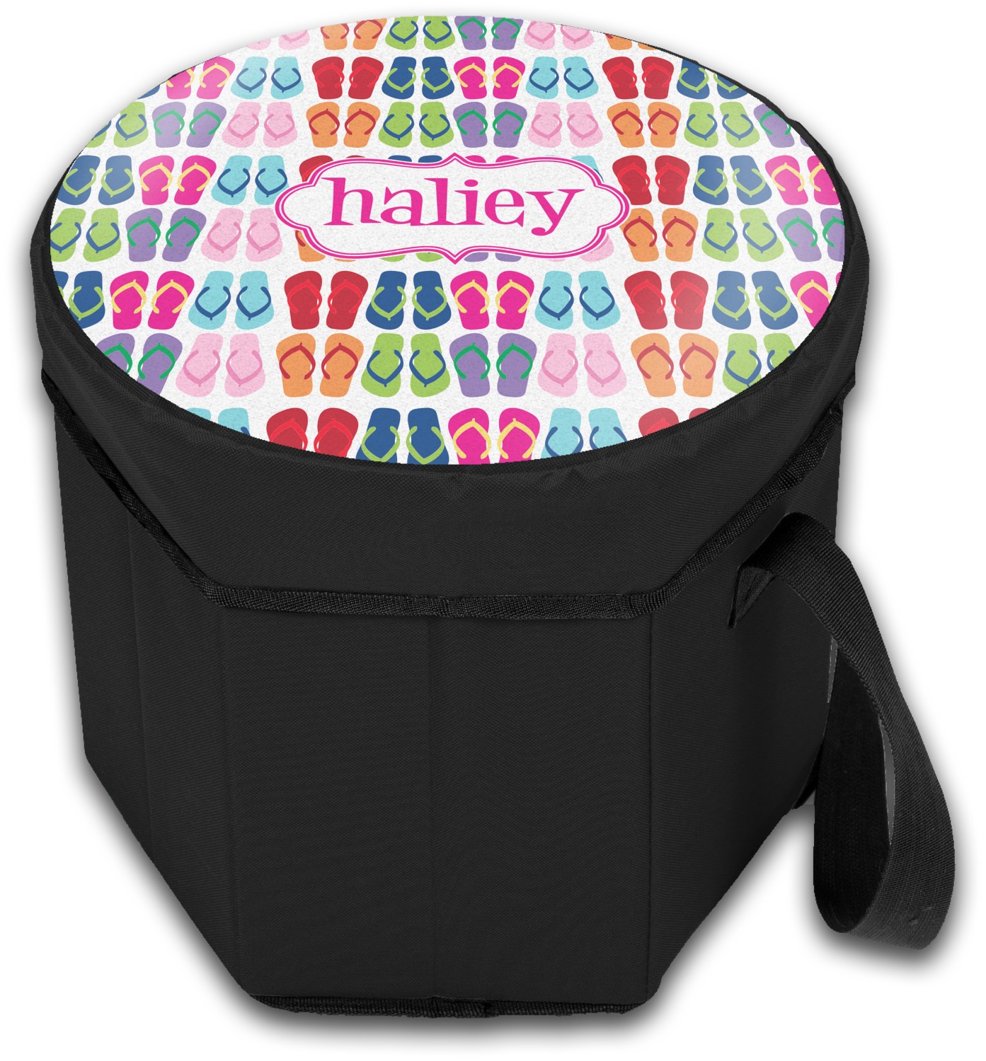Our collapsible insulated coolers feature a unique six-sided hexagon shape, are lightweight, durable and can be turned into a seat. This cooler is fully insulated with silver foil lining to keep food and drinks hot or cold, and has a 12-quart capacity. Although this cooler collapses for easy transport, hidden inside are composition panels made of sturdy wood that give the frame strength and allow this cooler to be used as a seat. Simply sit down on the personalized cover and give your legs a break! (Maximum weight capacity of 200 pounds.)