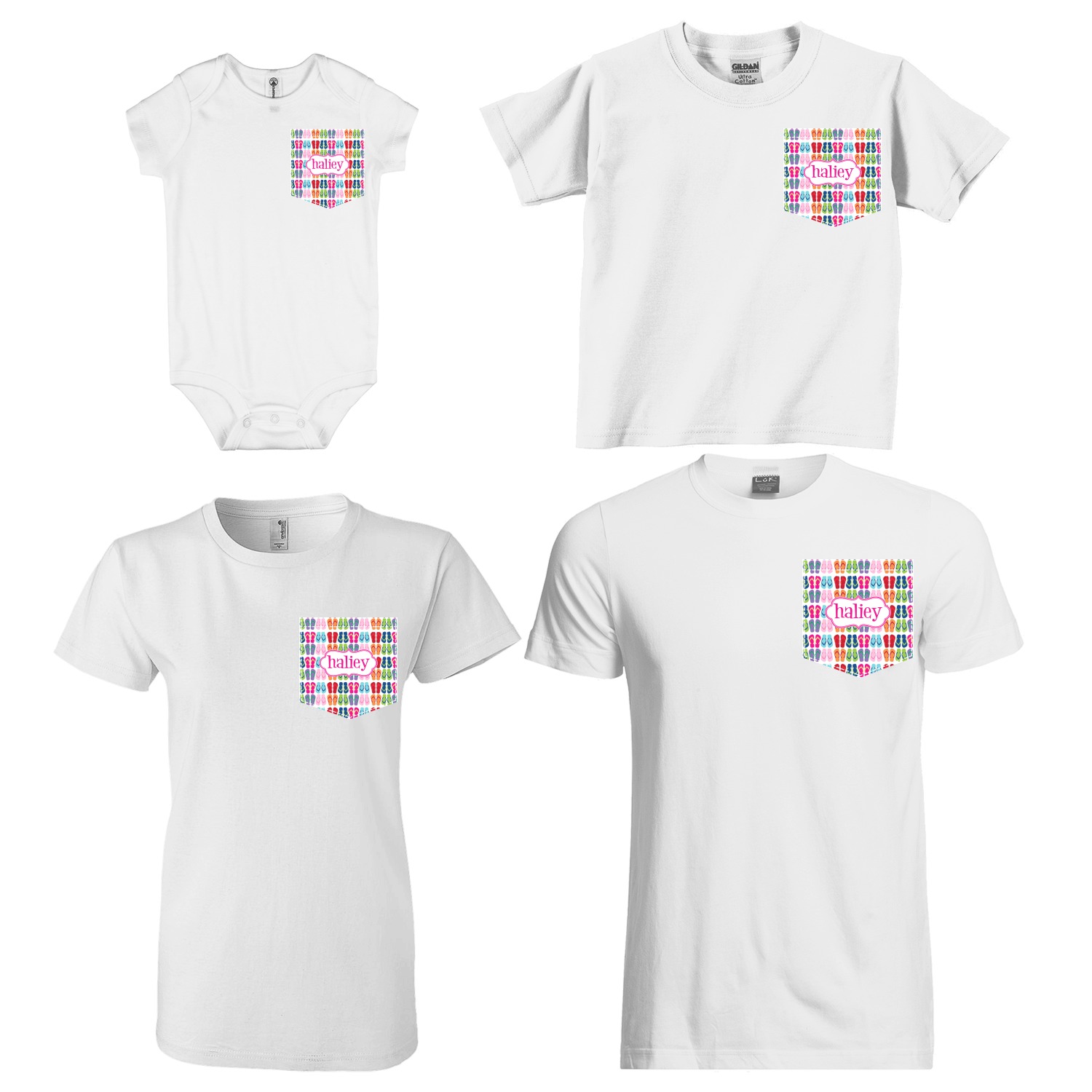 The faux pockets are available in 4 different sizes - for baby, kids, youth/women & men; the whole family can have the same pocket design, but sized just for them! The pockets are printed using our direct-to-film technology to the exact shape & size. We have faux stitching around the pocket, with double stitching on the top of the pocket to give it the authentic pocket look!