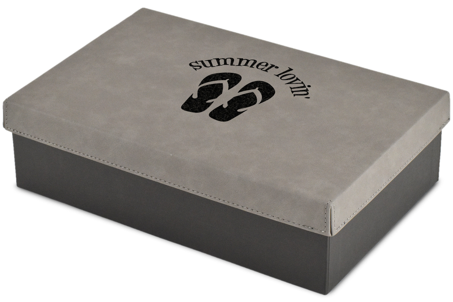 These gift boxes are available in 3 different sizes to accommodate various sized gifts. Available in gray as a neutral color for any occasion as well as to showcase your design boldly. Engraved with a laser this high quality paper board and faux leather gift box is unique and makes any gift stand out.