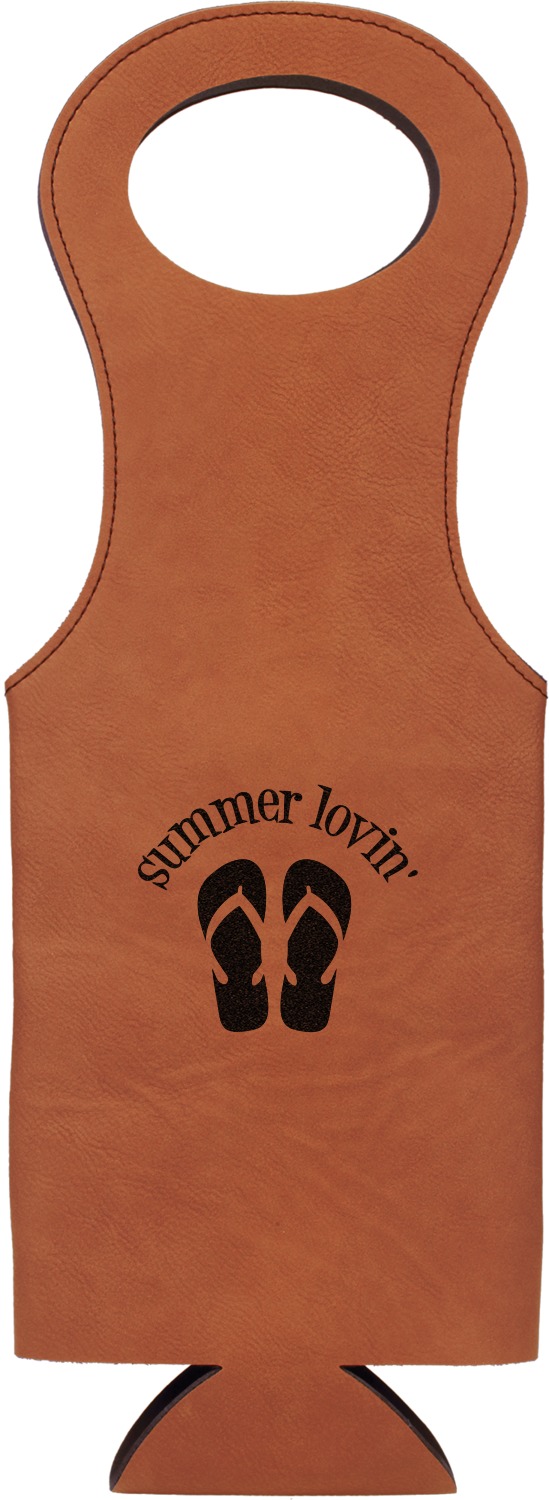 This wine carrier is made from a stunning leatherette, in a cognac-brown color. Strong, black stitching lines the sides of your wine bottle bag and provides extra durability. The interior is lined with a padded, black material to allow for a snug fit once your bottle is placed inside. At the top of this wine gift bag, you'll find two oval shaped handles that elegantly complements the rest of the bag's style. We provide you with the option of laser-engraving the front, or the front and back of your new personalized wine bag!