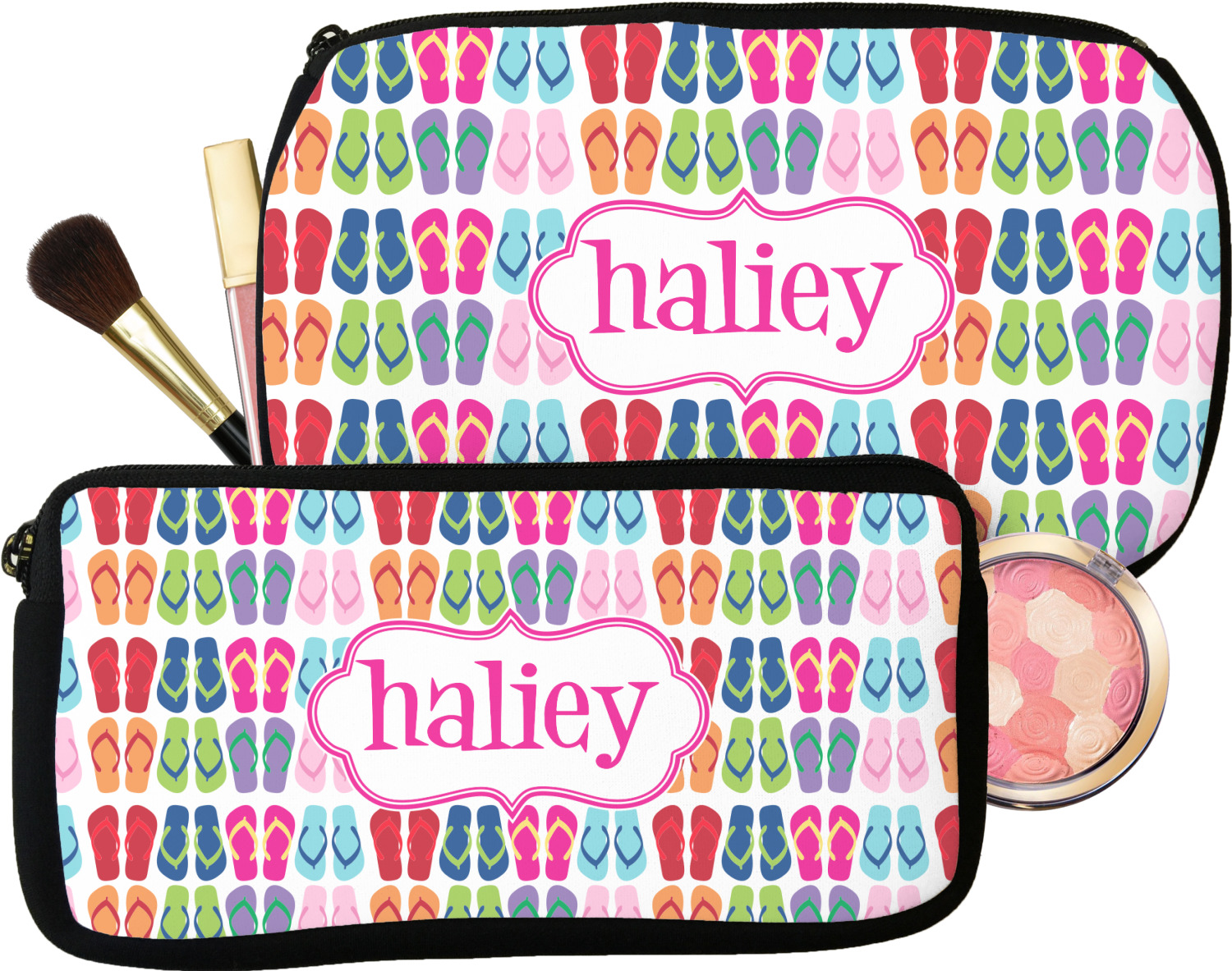 Our personalized makeup bags are available in many different designs, patterns and colors - so you are sure to find one that will love. They are made of neoprene (same material as wet-suits) and thus are water resistant, so spillages in your makeup bag will not end up all over you purse. They are customized on one side and are black on the other side and the zipper is black as well.