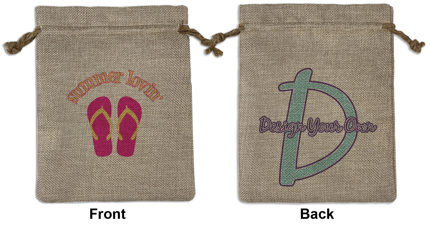 We sell our Burlap Gift Bags in 3 variant sized bags. Made with burlap polyester, each personalized bag can be secured with a twine drawstring pull. Your custom design is available to print on one side or both sides - completely up to you! The sizes of the bags measure approximately 4.5" x 6.5" for the smallest size, 6.5" x 8.0" for the medium size, and 6.5" x 13.5" for the large-sized bag.