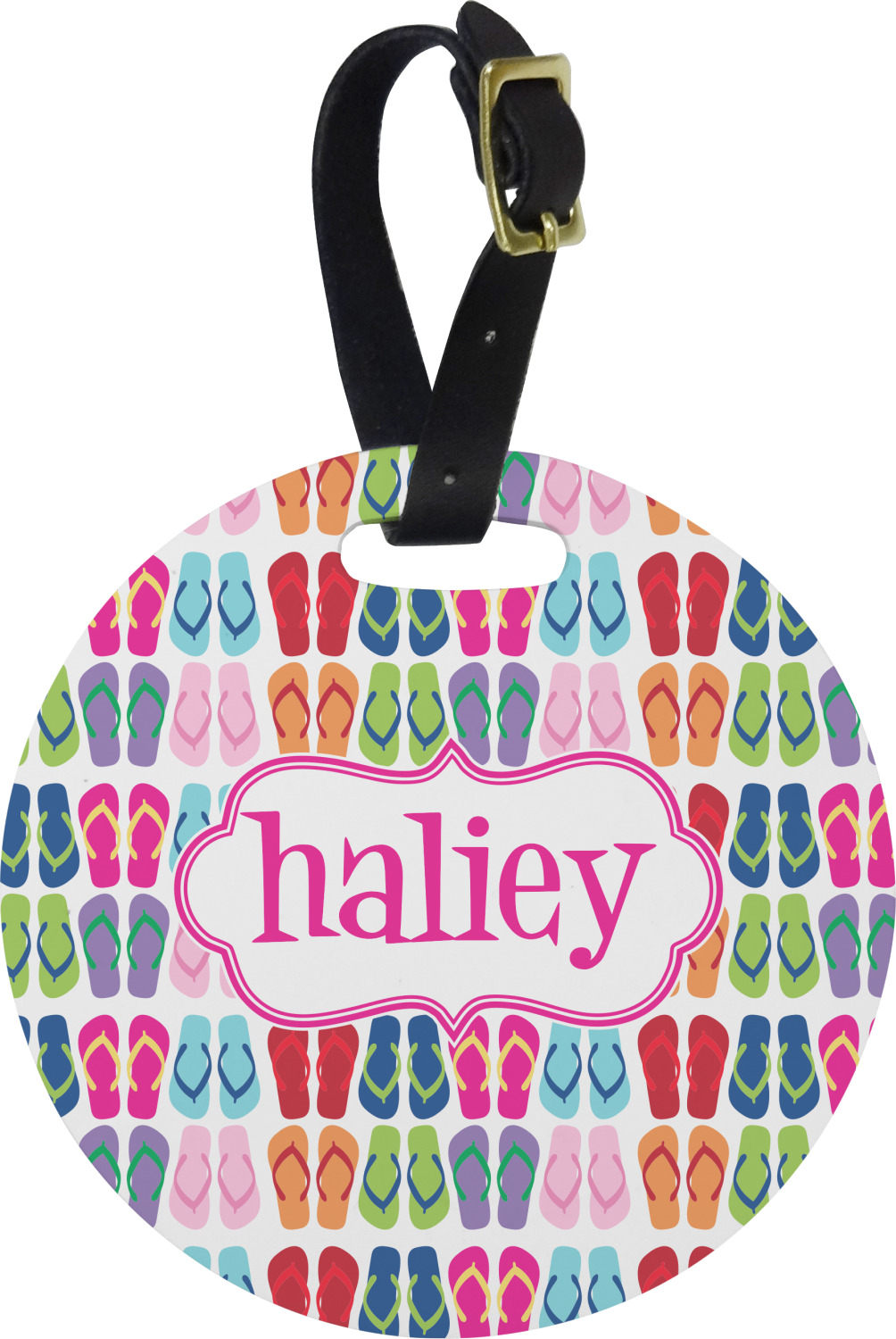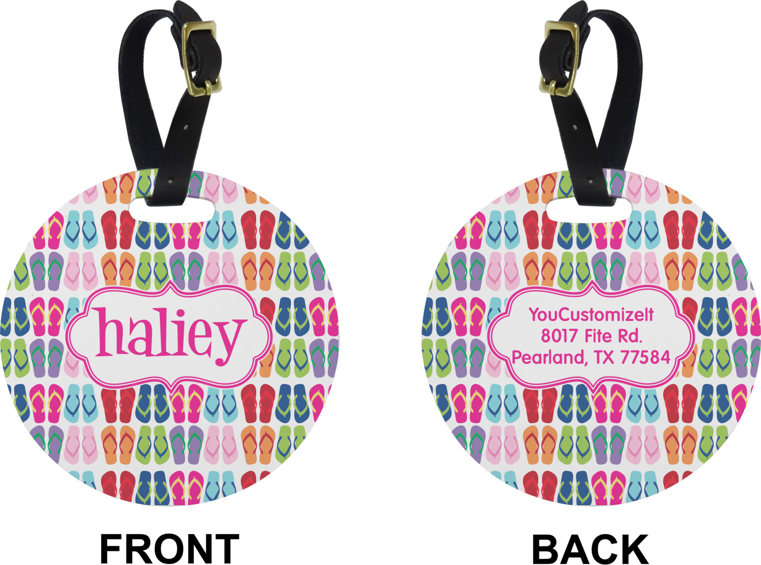 These personalized bag tags are sold in a variety of shapes, so that you may find the product that meets your vision exactly. We sell a round luggage tag, which measures at approximately 4" x 4". Our square luggage tag is about 3.5" x 3.5", while our rectangular version is 2.75" x 4 ".